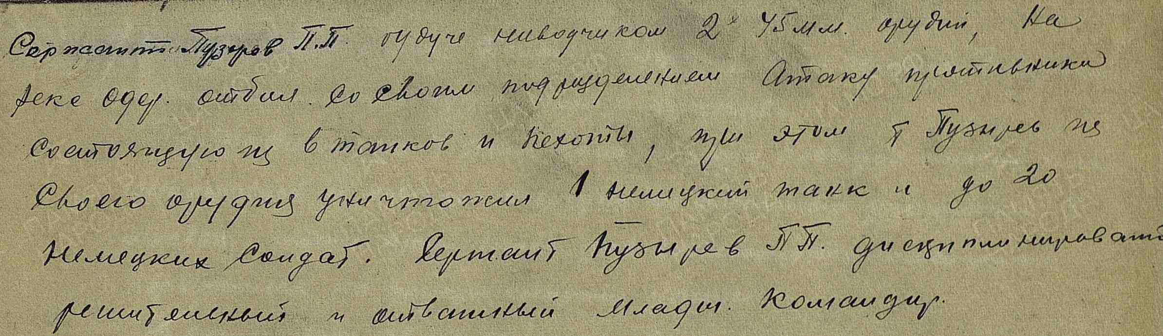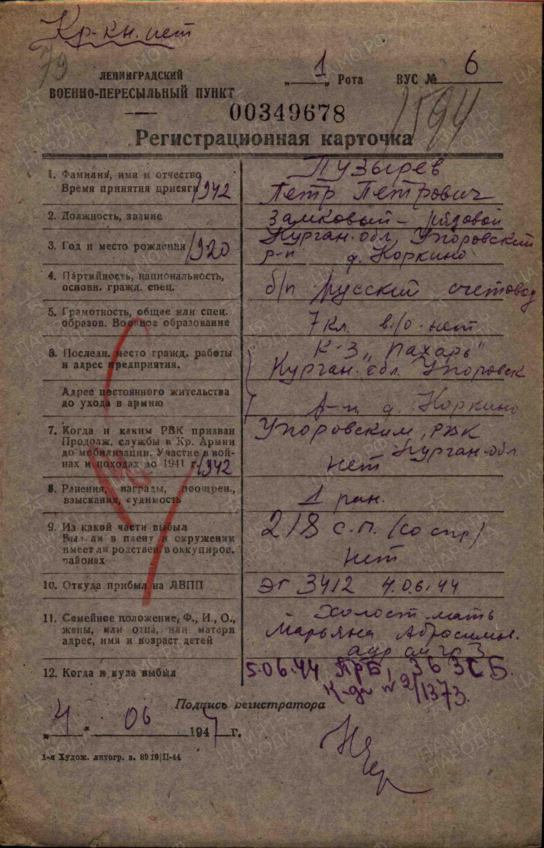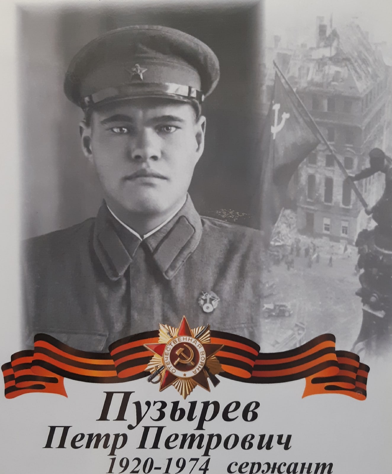 Война нарушила все планы, Перекроила все мечты… Позвольте представиться, Пузырёв Пётр Петрович – сержант гвардии, житель деревни Коркино, Упоровского района, Курганской области. История моих испытаний и моё становление начинается с 12 лет. Радость детства в моё время мало кто испытывал. Время тяжёлое было, у всех была какая-то нужда. Тяжело приходилось и моей семье. Мы, в буквальном смысле, выживали, как могли. Сначала отца схоронили в голодный 1933 год, мать с 8-ми месячной сестрой и 6-ти летним братом – это все кто у меня остался. И я стал за старшего. «Крутился» как мог, любой добытый кусок хлеба нёс в дом. Сестрёнке я стал за отца. Она и отца-то не помнила и не знала. Я всегда с удовольствием осваивал что-то новое и интересное. Образование я получил 7 классов. Учился я всегда охотно, желание к учёбе имел и рвение, но времени и возможностей не было, все силы уходили в семью, которая всегда была у меня на первом месте. Работать я пошёл в колхоз «Пахарь» в своей же деревне Коркино. Вроде только налаживаться всё стало, на ноги начал «вставать», жизни радоваться, как вдруг…война. Она внезапно поменяла судьбы всех, сломала мечты и разрушила планы. Наступило суровое и тяжёлое для всех время. Война стала жестокой реальностью каждой семьи, каждой судьбы. Задача у всех Советских людей была одна – дать решительный отпор врагу. Отстоять своё право на свободу и независимость. Было объявлено о всеобщей мобилизации населения. Страха не было. Переживания были за семью, за мать и сестру с братом. Я чувствовал ответственность и шёл воевать за них, за народ, за Родину. В начале войны желающих попасть на фронт оказалось очень много. Молодые ребята стремились к подвигам и боялись только одного, что не успеют их совершить до конца войны. Правда, к концу 1941 года это рвение уже поубавилось. Военного образования у меня не было. На службе в Рабоче-крестьянской Красной Армии (РККА) я состоял с октября 1940 года. На войну меня призвал Упоровский РВК, Тюменской обл. В начале войны я попал на службу в 23 гвардию мотострелковой бригады первого Украинского флота в звании замкового рядового. В 1942 году я перешёл в 218 стрелковый полк 80-стрелковой дивизии. В составе этой же 80 дивизии я прошёл весь свой боевой путь. Мы быстро поняли, что война по головке не погладит и никого не пощадит, но мы не боялись смотреть смерти в глаза. Сражались до последнего. Все как один. Увидев все ужасы войны, мы понимали только то, что необходимо действовать, необходимо биться до последнего, до последней капли крови. Никто не пытался спасать свою жизнь, все действовали слажено и сообща. Я прошёл всю войну. Всё пережил. И каждый день рисковал быть последним. Здесь каждый второй просыпался с мыслью: «выживу ли я сегодня». Шли дни, недели, месяцы, годы… Дошел до Берлина. 2 января 1942 года получил тяжёлое ранение на Западном фронте, лёгкое ранение получил 27 января 1944 года на Волховском фронте и ещё одно лёгкое ранение 20 марта 1944 года на Ленинградском фронте. Три ранения. Но я выжил. В отличие от товарищей, которые умирали и гибли у меня на глазах. Никто и представить себе не мог, какой долгой, жестокой и опустошительной будет эта война, какого огромного напряжения она потребует, каких многочисленных жертв наших людей… За свои боевые заслуги в 1944 году мне было присвоено звание сержанта, меня назначили младшим командиром