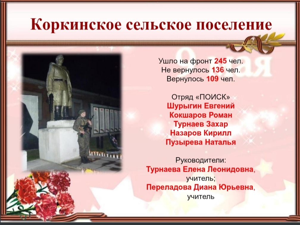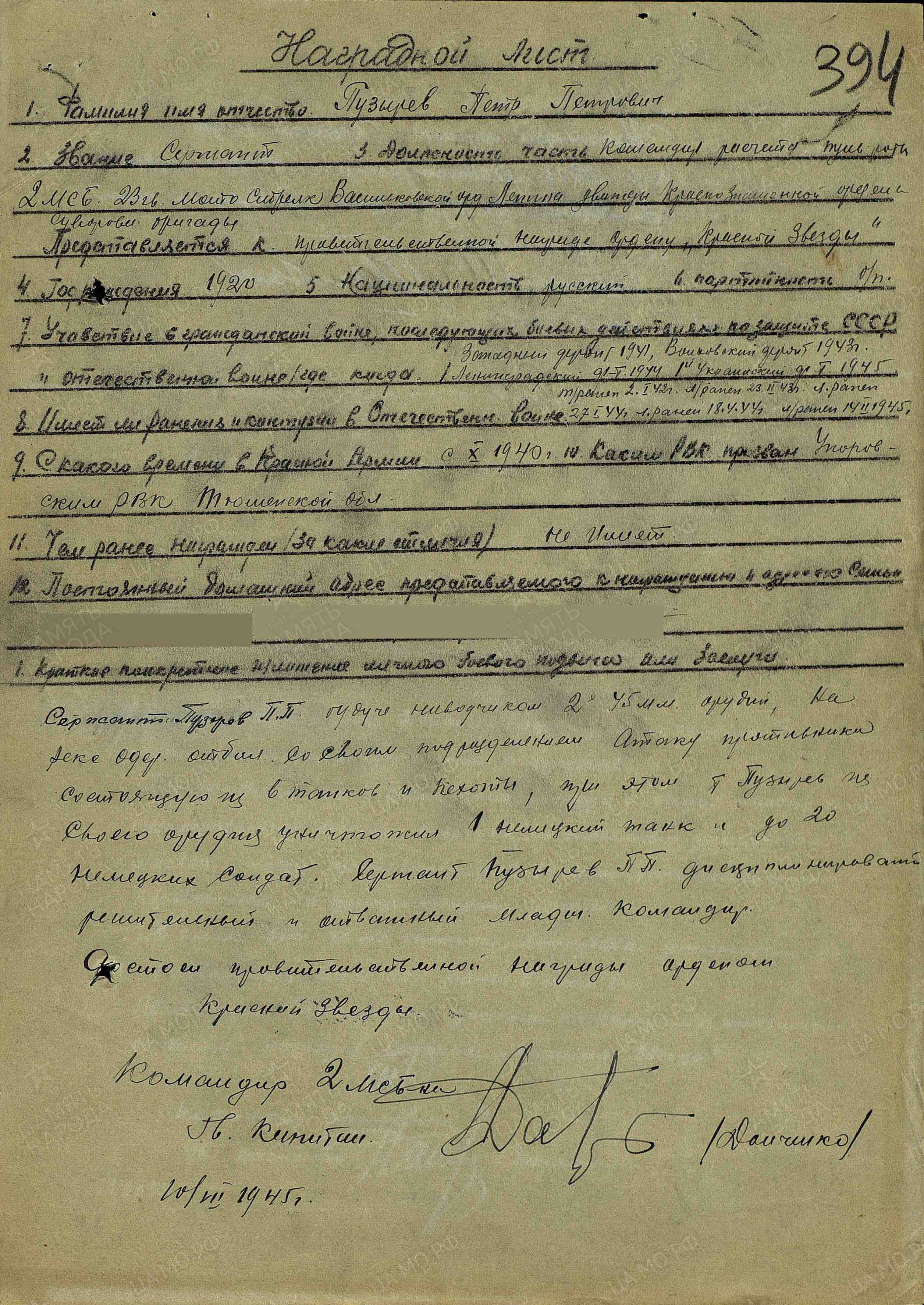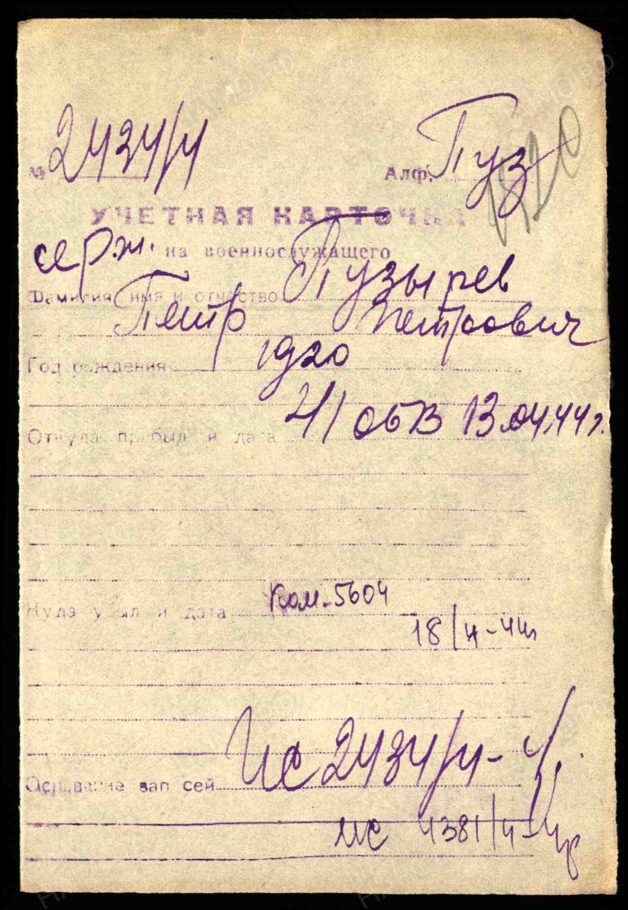 Война нарушила все планы, Перекроила все мечты… Позвольте представиться, Пузырёв Пётр Петрович – сержант гвардии, житель деревни Коркино, Упоровского района, Курганской области. История моих испытаний и моё становление начинается с 12 лет. Радость детства в моё время мало кто испытывал. Время тяжёлое было, у всех была какая-то нужда. Тяжело приходилось и моей семье. Мы, в буквальном смысле, выживали, как могли. Сначала отца схоронили в голодный 1933 год, мать с 8-ми месячной сестрой и 6-ти летним братом – это все кто у меня остался. И я стал за старшего. «Крутился» как мог, любой добытый кусок хлеба нёс в дом. Сестрёнке я стал за отца. Она и отца-то не помнила и не знала. Я всегда с удовольствием осваивал что-то новое и интересное. Образование я получил 7 классов. Учился я всегда охотно, желание к учёбе имел и рвение, но времени и возможностей не было, все силы уходили в семью, которая всегда была у меня на первом месте. Работать я пошёл в колхоз «Пахарь» в своей же деревне Коркино. Вроде только налаживаться всё стало, на ноги начал «вставать», жизни радоваться, как вдруг…война. Она внезапно поменяла судьбы всех, сломала мечты и разрушила планы. Наступило суровое и тяжёлое для всех время. Война стала жестокой реальностью каждой семьи, каждой судьбы. Задача у всех Советских людей была одна – дать решительный отпор врагу. Отстоять своё право на свободу и независимость. Было объявлено о всеобщей мобилизации населения. Страха не было. Переживания были за семью, за мать и сестру с братом. Я чувствовал ответственность и шёл воевать за них, за народ, за Родину. В начале войны желающих попасть на фронт оказалось очень много. Молодые ребята стремились к подвигам и боялись только одного, что не успеют их совершить до конца войны. Правда, к концу 1941 года это рвение уже поубавилось. Военного образования у меня не было. На службе в Рабоче-крестьянской Красной Армии (РККА) я состоял с октября 1940 года. На войну меня призвал Упоровский РВК, Тюменской обл. В начале войны я попал на службу в 23 гвардию мотострелковой бригады первого Украинского флота в звании замкового рядового. В 1942 году я перешёл в 218 стрелковый полк 80-стрелковой дивизии. В составе этой же 80 дивизии я прошёл весь свой боевой путь. Мы быстро поняли, что война по головке не погладит и никого не пощадит, но мы не боялись смотреть смерти в глаза. Сражались до последнего. Все как один. Увидев все ужасы войны, мы понимали только то, что необходимо действовать, необходимо биться до последнего, до последней капли крови. Никто не пытался спасать свою жизнь, все действовали слажено и сообща. Я прошёл всю войну. Всё пережил. И каждый день рисковал быть последним. Здесь каждый второй просыпался с мыслью: «выживу ли я сегодня». Шли дни, недели, месяцы, годы… Дошел до Берлина. 2 января 1942 года получил тяжёлое ранение на Западном фронте, лёгкое ранение получил 27 января 1944 года на Волховском фронте и ещё одно лёгкое ранение 20 марта 1944 года на Ленинградском фронте. Три ранения. Но я выжил. В отличие от товарищей, которые умирали и гибли у меня на глазах. Никто и представить себе не мог, какой долгой, жестокой и опустошительной будет эта война, какого огромного напряжения она потребует, каких многочисленных жертв наших людей… За свои боевые заслуги в 1944 году мне было присвоено звание сержанта, меня назначили младшим командиром