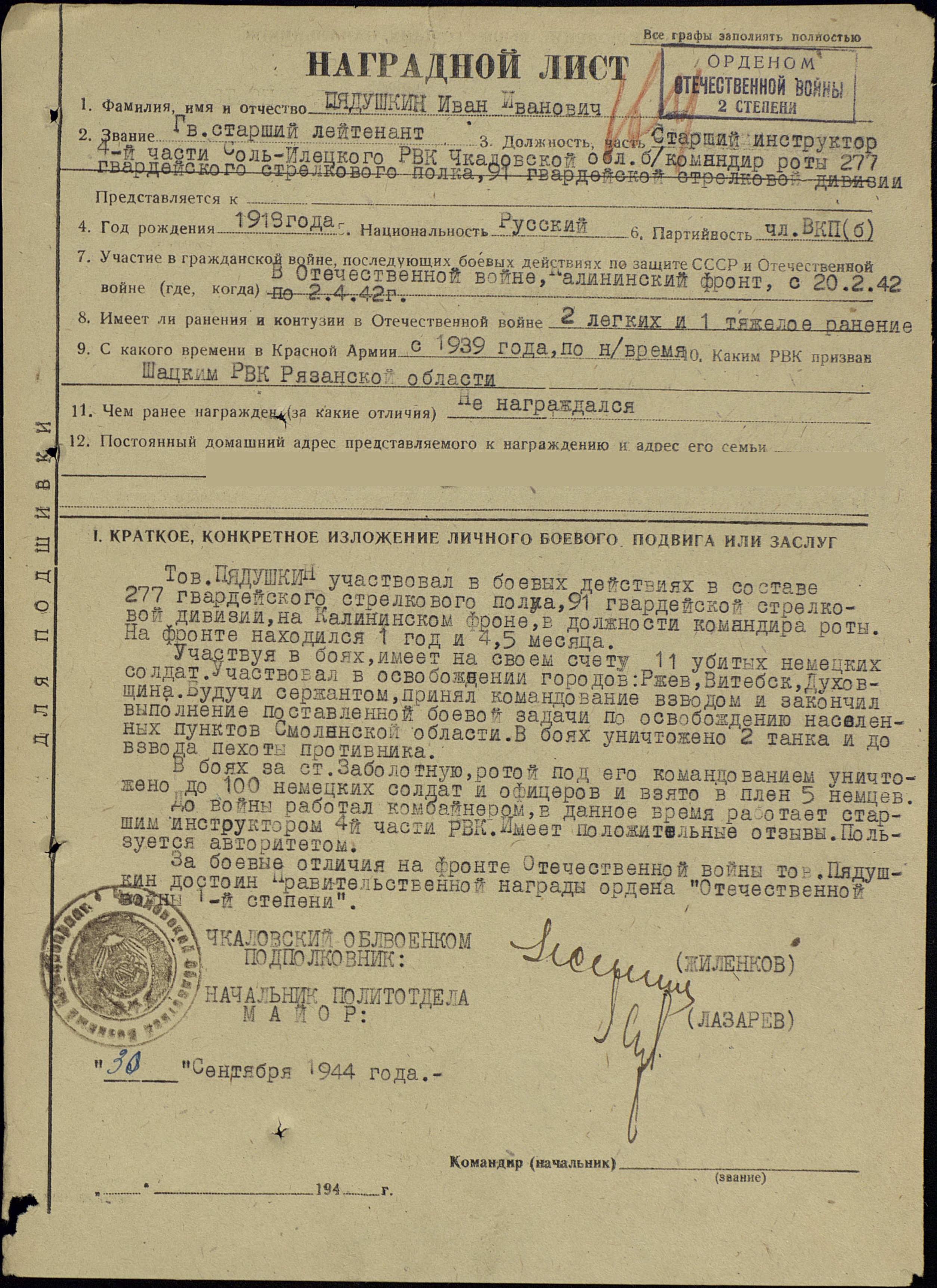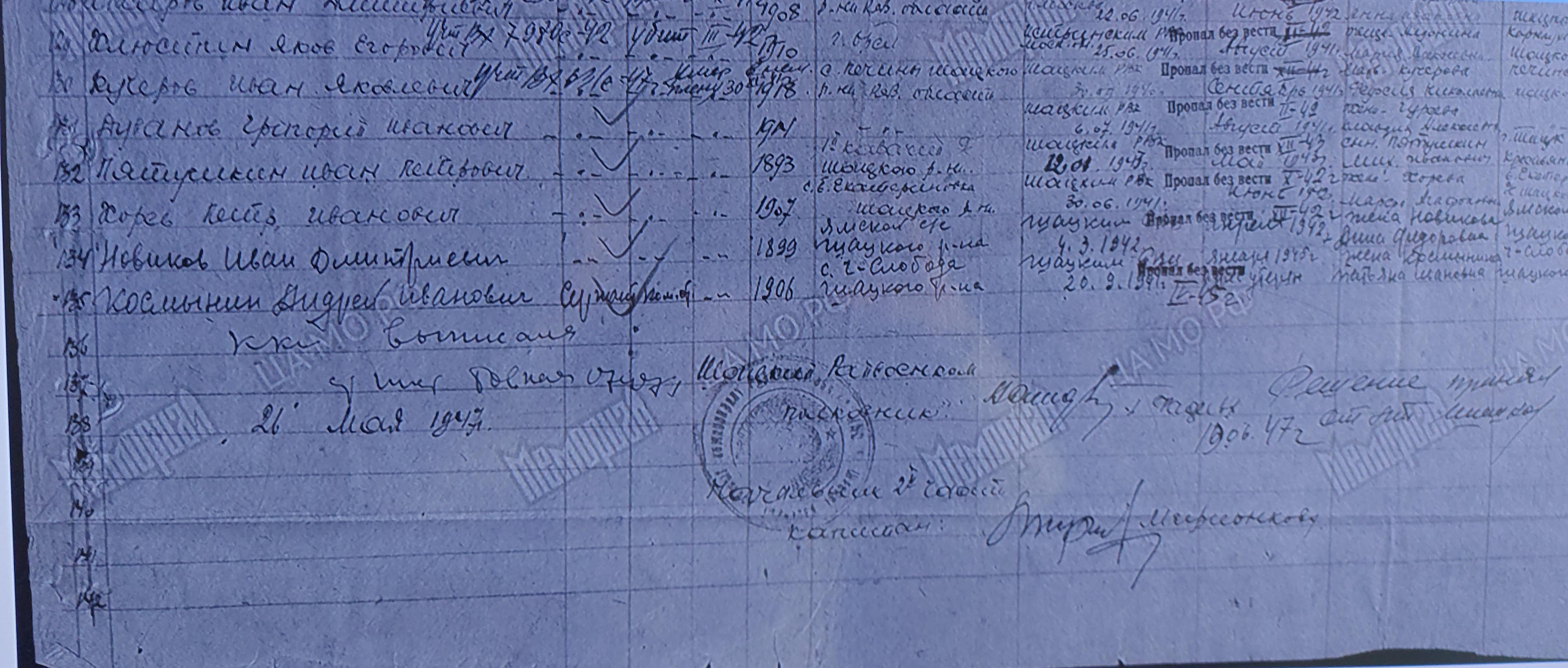 Мой прадед Пядушкин Иван Петрович( ошибка в документах записан как Пятушкин И. П), пропал без вести под Москвой ! Забрали на оборону Москвы 1941г, хотя по возрасту не подходил. Три сына тоже воевали, кого нашёл Пядушкин Иван Иванович был ранен в сердце бог миловал выжил и прожил 80 с лишнем лет, Пядушкин Михаил Иванович, Пядушкин Василий Иванович, к сожалению не чего не знаю, все вернулись. Документы прилагаются 132строка, его сын Михаил записан как родственник. В строке исправления пропал без вести 1941году! Ниже фото прилагаются. Миллионы павших героев похоронены в братских могилах как «неизвестные». Во время войны их семьи получали извещения, что они пропали без вести, такими и числятся 80 лет почти, после окончания боев. Неужели за минувшие годы не найдено решение, как вернуть из безвестности реальные имена? Министерства обороны есть ясные и прямые указания на первичные места захоронений бойцов, фамилии многих погибших до сих пор не увековечены на мемориальных плитах и, соответственно, отсутствуют в по фамильных списках и учетных карточках расположенных поблизости воинских захоронений. По сути, солдаты остаются забытыми!!!