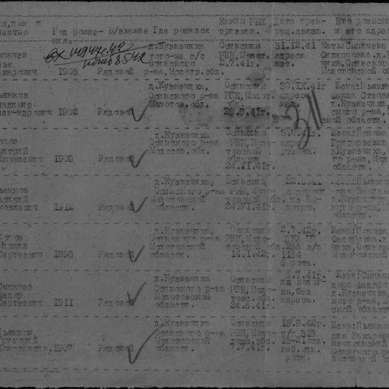Пьянков Григорий Константинович 1907 года рождения, уроженец села Кузнечиха Осинского района Молотовской области. Призван Осинским РВК Молотовской области. Принимал участие в Ржевско-Сычевской операции. Воинское звание рядовой. Пропал без вести в боях подо Ржевом. Последнее место службы 318 п/п 15-21 отд.каб.мин. рота. Исключен из списков части в ноябре 1942 года.