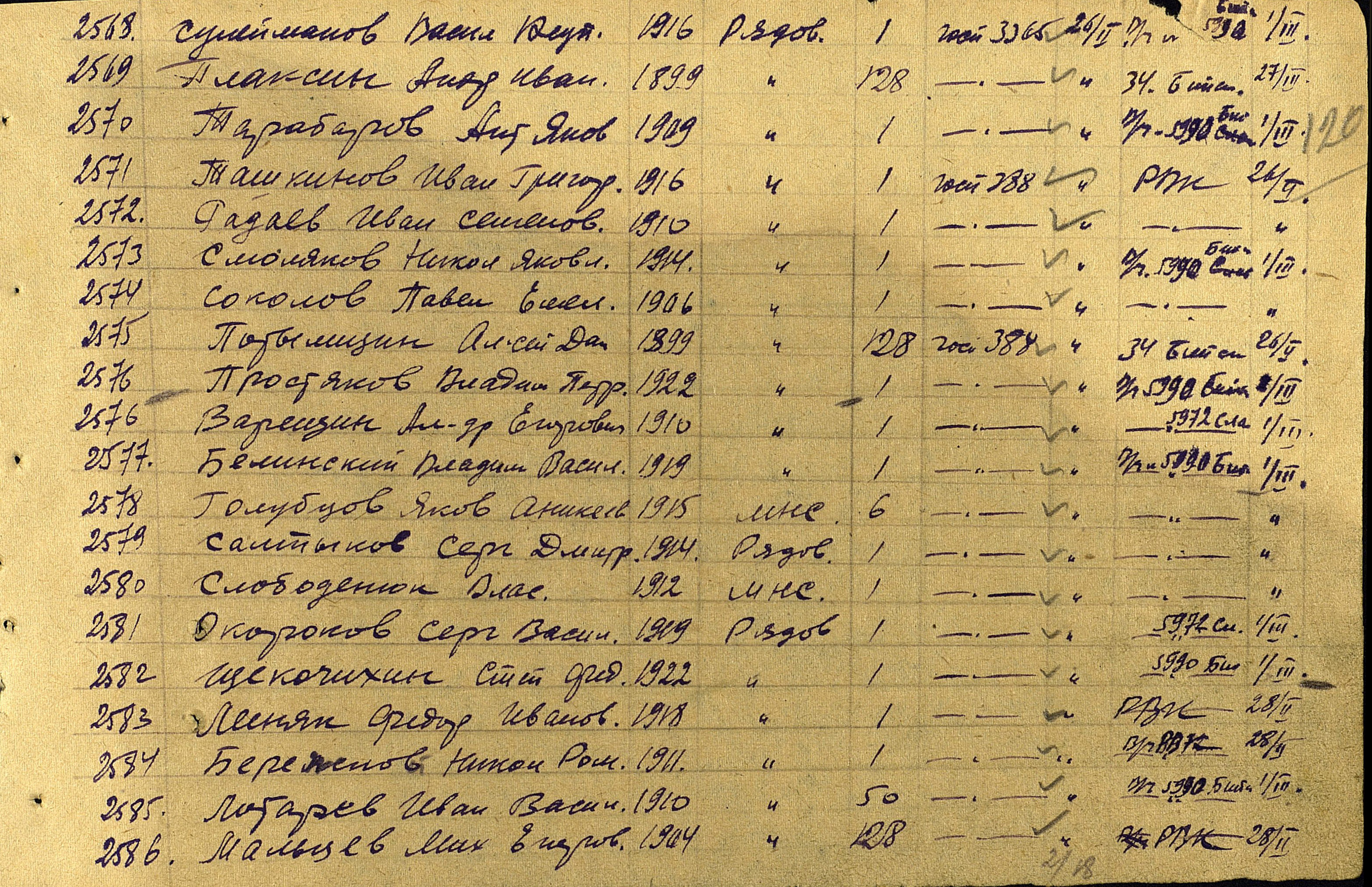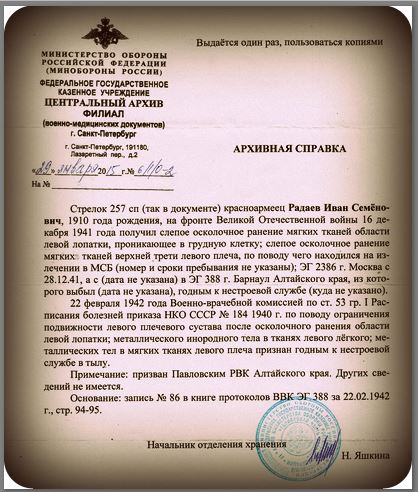 Наш дедушка Радаев Иван Семенович, рано остался без матери Агафьи Александровны. и в 12 лет уже подрабатывал, на частных подворьях, делал всякую работу по хозяйству, затем отучился на тракториста, и работал в МТС. вскоре пошел на срочную службу в РККА, потом женился и в 1935-м родился первенец, всего перед войной у них с нашей бабушкой родилося трое детей, в 1939-м ушел на Финскую войну в составе 56-й СД. 184 СП прошел все три месяца войны, вскоре грянула Великая Отечественная, 26 июня 1941 года, эшелоном в составе 107-й СД. 630 СП, дедушка попал под Москву. под деревню Митино Смоленской области,провоевав месяц 14 августа пулеметчик Радаев с ранением поступил в госпиталь ЭГ-2913, после лечения 5 октября направлен под Калинин в 185 СД 257 СП, там в жарких сражениях уже при контрнаступлении нашей армии получил второе тяжелое осколочное ранение 16 декабря 1941 года, под деревней Тургиново, Тверской области, 155 медсанбат. потом госпиталь в Москве в Тимирязевке. Затем на долечивание направлен в ЭГ-388 города Барнаула, в конце февраля 42-го признан нестроевым, и до декабря 1942 года служил в районе Ворошиловграда, точных сведений нет об этом периоде его военной судьбы, известно только что попадали они туда скрытно по Волге на баржах ночью сплавлялись в трюме с капустой, при обороне Сталинграда он не раз рисковал жизнью, доставляя обед в свое подразделение с полевой кухни, и попадал под авиацию противника, Там он получил третье свое ранение, контузию, и в декабре 1942 комиссован домой с фронта, далее труд в полеводстве, растил шестерых своих детишек, бригадир трактористов, награжден медалью За освоение целины", а также за боевые подвиги орденом Красной Звезды. орденом Отечественной войны 1-й степени, и другими наградами... Умер в 1994-м году. похоронен в родном селе. Помним, любим, гордимся!