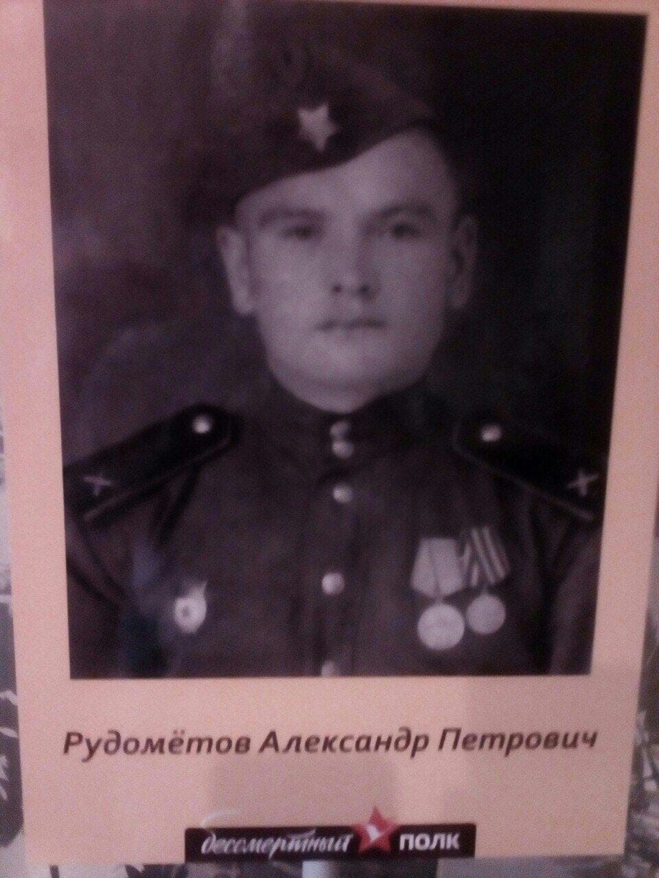 Мой прадед, Рудомётов Александр Петрович, 1925 года рождения, вызвался добровольцем на фрон в 17 лет. На фронт его не взяли, но направили на обучение в военное училище, а по достижении 18 лет прадед попал в действующую армию.