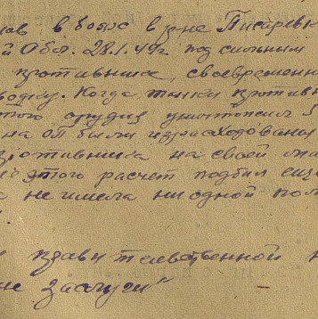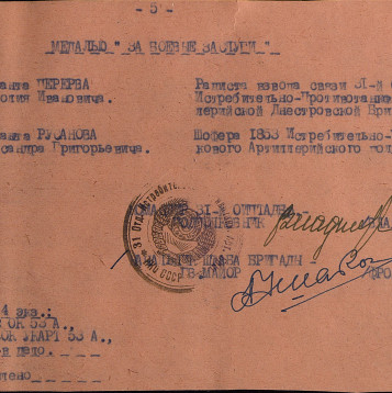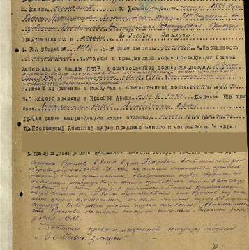 артиллерийской бригады.Боевой путь: прошел всю войну с 1941 по 1945 г.г. 30.06.1941-06.1942 Калининский фронт;06.1942-07.1943 Сталинградский фронт;07.1943 Воронежский фронт;01-02.1944 Корсунь-Шевченковская операция по освобождению южной Украины.1944-1945 Освобождал Молдавию, Румынию, Австрию, Чехословакию.Победу встретил 8.05.1945 года в Чехословакии, город Зноймо.Ранения: легко ранен 25.08.1943г.Награды: Медаль "За боевые заслуги"Описание подвига: "Сержант