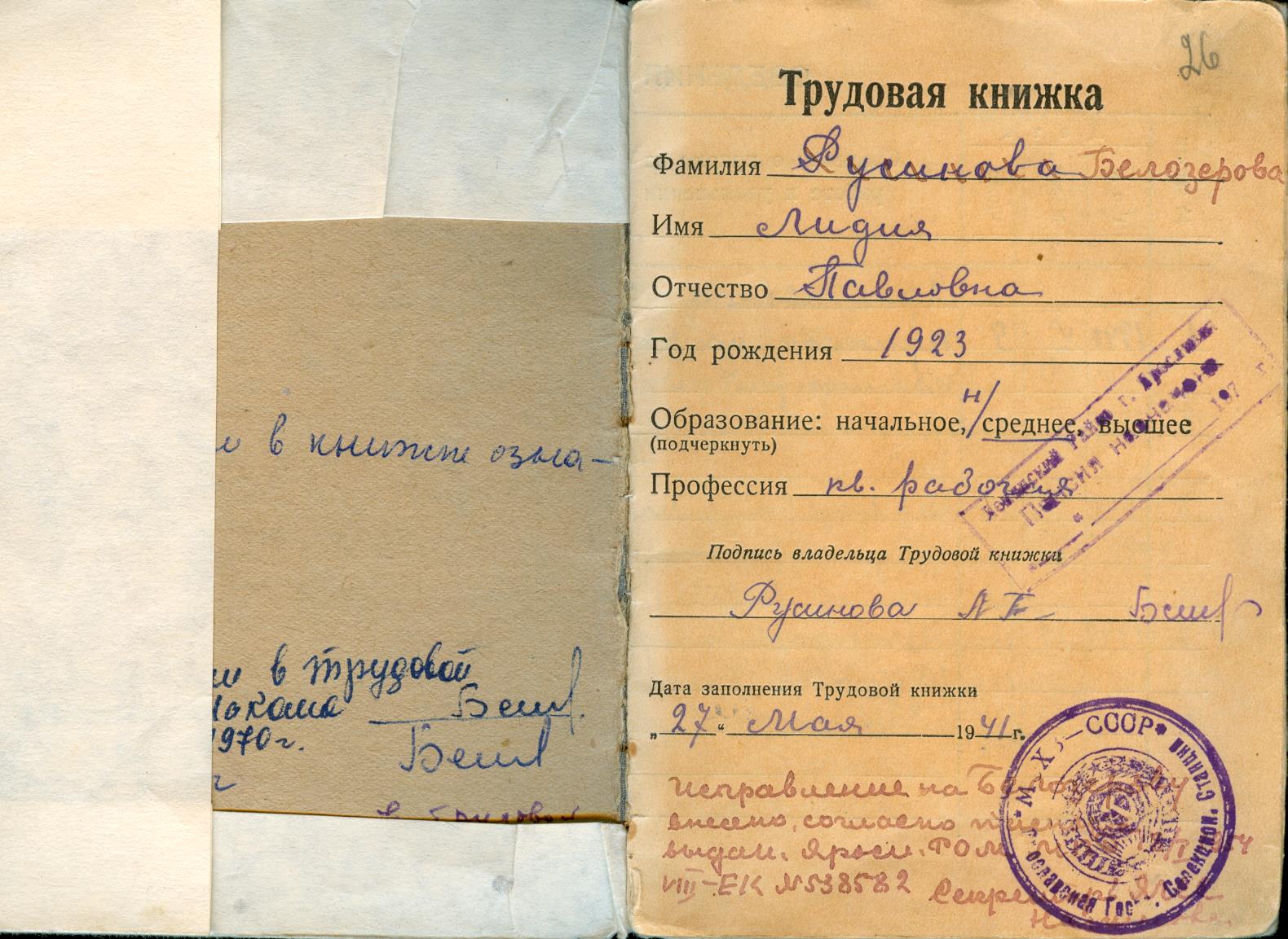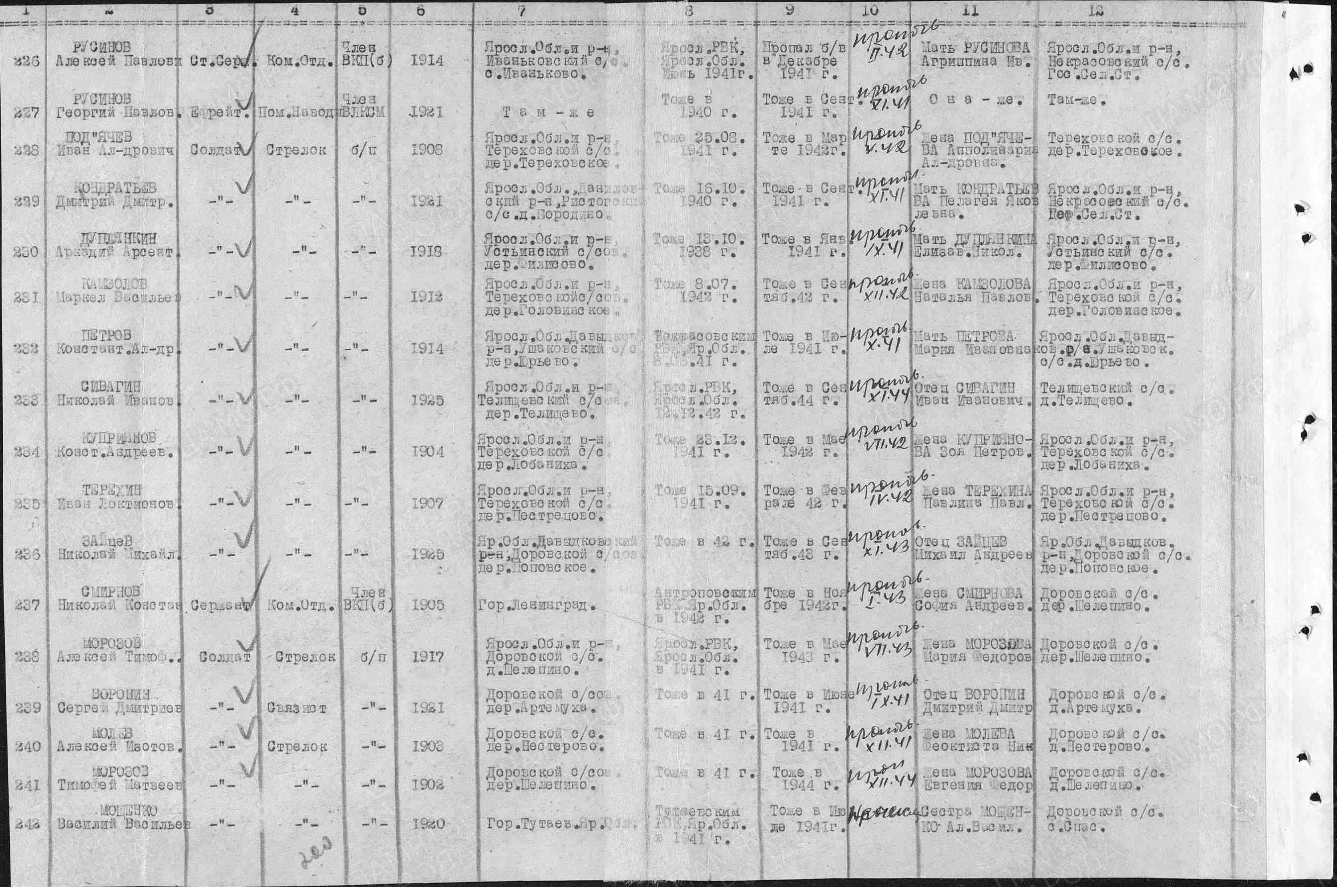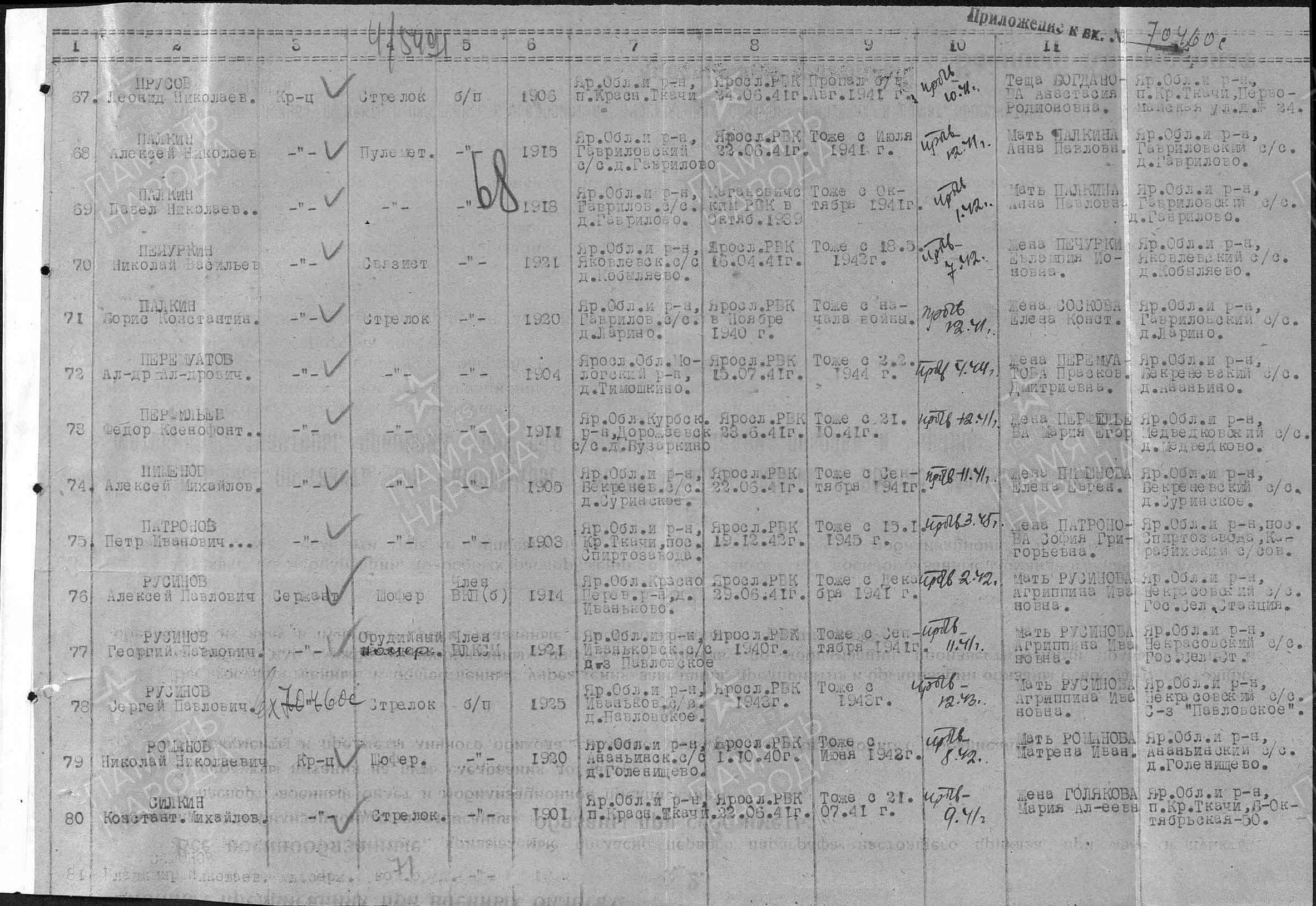 Русиновы Рассказ Автор Логинов Денис Антонович, МОУ «Средняя школа № 17» г. Ярославль Наставник Русинова Наталья Александровна, заведующая библиотекой, руководитель музея МОУ «Средняя школа № 17» г. Ярославль Г. Ярославль, 2023 Великая Отечественная война коснулась судьбы нашей семьи, как и многих других. Одни из моих родственников героически защищали страну на полях сражений, другие самоотверженно трудились в тылу. Жизнь каждого из них – пример беззаветного служения Родине. Мой рассказ о сестре и братьях моего прадеда Александра Павловича Русинова (1927-1997). Один из них погиб под Москвой, а сестра Лидия (1923-2016) за баранкой грузовика возила колхозные продукты в столицу. Я помню, как мы с бабушкой приходили к ней в уютной домик на улице 1-Краснохолмской, пили чай в саду, в беседке. Иногда Лидия Павловна рассказывала о прошлом. Родилась она 8 января 1923 года в колхозе Павловское Ярославского уезда . Павловское – бывшее имение купцов Вахрамеевых, которым больше 10 лет служили ее родители Агриппина Ивановна и Павел Сергеевич Русиновы. Летом этого же года с пятью сыновьями и маленькой Лидой на руках переехали в село Михайловское, рядом с поселком Норское г.Ярославля (где мы живем), вступили в колхоз. Перед войной Лида окончила норскую школу (средняя школа № 17, где я учусь). Страшная весть о начале войны не сразу дошла до ее сознания. Стало жутко лишь после слов любимого брата Алексея. Повестку он получил в первые дни. Перед отправкой подошел к сестренке, поцеловал ее и сказал: «Знаешь, малышка, наверное, мы больше не увидимся». Первым из Русиновых погиб Георгий (1921–1941). В сентябре 1941-го под Белой Церковью попал в окружение. Выживший после кровавой мясорубки однополчанин рассказал, что помощник наводчика ефрейтор Русинов был окружен, но не бросил орудия. Ему едва исполнилось двадцать лет. 26 сентября Киевская стратегическая оборонительная операция советских войск была закончена. Семья же получила извещение: «Пропал без вести». Он погиб под Москвой Старший брат, Алексей (1914–1942), родился в 1914 г. в усадьбе Павловское Ярославского уезда. По семейному преданию, сам хозяин Николай Вахрамеев стал крестным первенца Русиновых. Купец был в Ярославле фигурой заметной. Он владел свинцово-белильным заводом (ныне «Русские краски») и табачной фабрикой, был гласным городской думы. Крестной была подруга Агриппины Липа Куропаткова из Норского, тетя будущего Героя Советского Союза Н.Ф. Куропаткова, также работавшая в усадьбе. В 1937 году в Харитонове (где большой семье дали полдома) в бывших помещичьих домах поселились специалисты Мологской селекционной станции с семьями. Русиновы хорошо знали многих работников станции, так как были родом из Иловны Мологского уезда. Станцию перевели в Михайловское в связи с затоплением Мологи Рыбинским водохранилищем. Алексей окончил Норскую школу, профессиональное училище при автозаводе и был назначен механиком в хозяйство. Очень подружился с молодыми инженерами, частенько гостил в соседнем доме. Его друг - инженер провел Русиновым телефон и радио. Страшные были это годы. Ночами появлялся «воронок», и один за другим друзья исчезали в водовороте репрессий. Ярославская учительница Галина Дмитриевна Изотова (заслуженный учитель России, кавалер орденов Ленина и Трудового Красного Знамени) оставила тёплые воспоминания о своём де