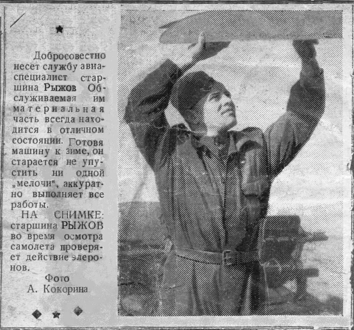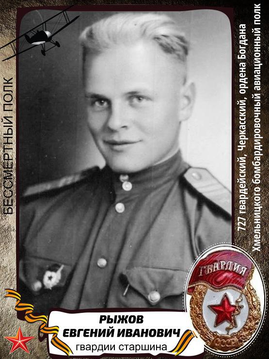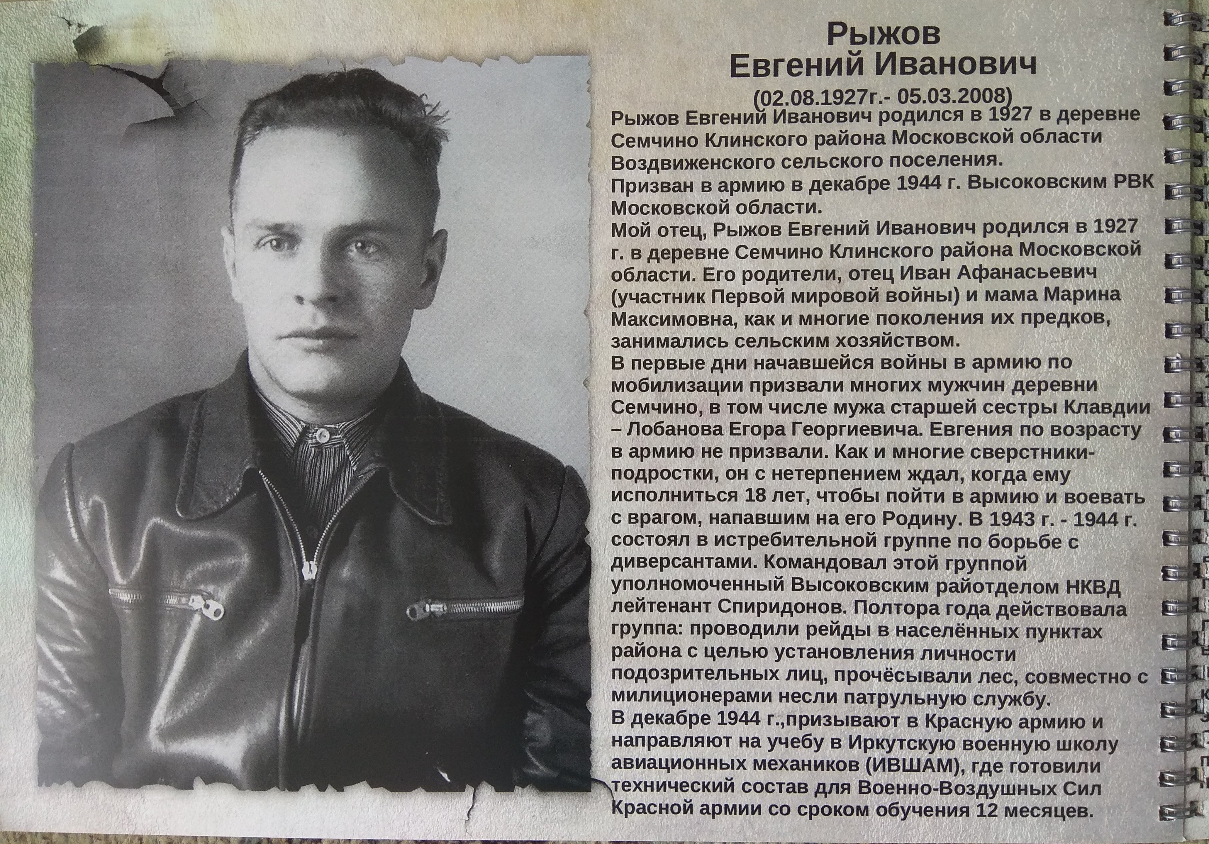 Рыжов Евгений Иванович (02.08.1927 - 05.03.2008) родился в деревне Семчино Высоковского района Московской области. В годы войны (1943-1944гг.) до призыва в ряды Вооруженных Сил, состоял в истребительной группе по борьбе с диверсантами (проводили прочёсывание лесов по установлению личности подозрительных лиц и т.д.). Командовал группой уполномоченный Высоковским райотделом НКВД лейтенант Спиридонов. Было выдано боевое оружие. Полтора года действовала группа. Было совершено несколько рейдов по обезвреживанию зажигательных бомб. С 08 .12.1944 г. по 07.1946г. в составе Иркутской авиационной школы авиамехаников проходил службу в рядах действующей армии (2-ая воздушная армия, 727 авиационная дивизия, 161 гвардейский бомбардировочный авиационный Черкасский Ордена Богдана Хмельницкого, полк) в качестве авиамеханика самолёта ПЕ-2. После окончания войны, будучи в воинской части в составе Центральной Группы войск (Австрия, пос. Гётцендорф-ан-дер-Лайта), (с 07.1946г. по 10.1952г.) прослужил в в/ч 64344 в звании гвардии старшина. Был награжден медалями "За Победу над Германией", "30 лет Советской Армии и Флота". В 2000г. было присвоено звание "Участник и Ветеран ВОВ". Звание "Ветеран труда" было присвоено за многолетний и безупречный труд в должности ведущего инженера в НПО "Исток" г. Фрязино.