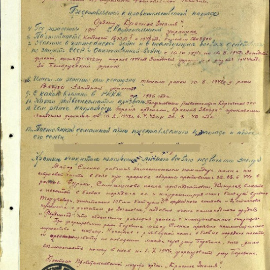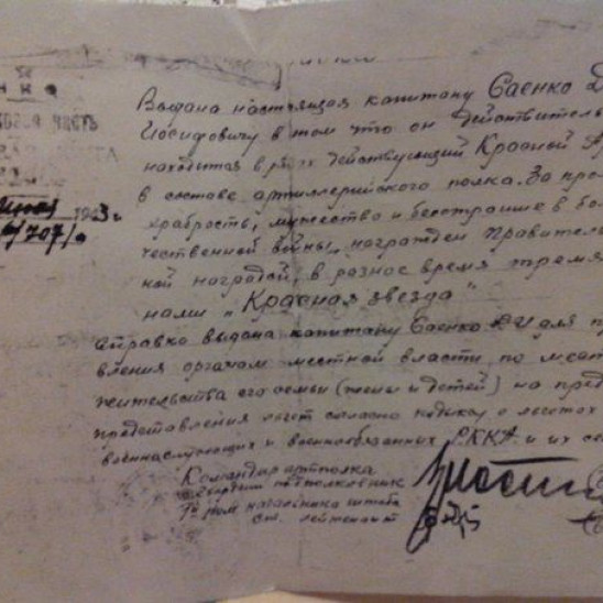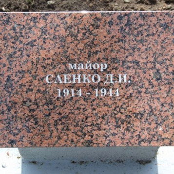 Отец,Саенко Дмитрий Иосифович, воинское звание- майор, должность- заместитель командира 846 артполка, 277 стрелковой Рославльской Краснознаменной орденов Суворова и Кутузова дивизии. Родился в Киргизии,в 1914г. в семье колхозников. Окончил десятилетку,работал в правлении колхоза, в 18 лет был призван в Красную Армию и всю свою короткую жизнь посвятил служению Отечеству. В действующую Армию был направлен в 1941 году. Воевал на Калужском направлении, за проявленную храбрость, мужество и бесстрашие в боях Отечественной войны, награжден 10 февраля, 6 апреля и 20 сентября 1942 года (тремя) орденами "Красной Звезды". В боях при прорыве обороны противника 22-23 июня 1944 года, в районе Бураки,Симашково после арт.подготовки двинулся вместе с пехотой в боевых порядках её и корректируя огонь батарей в районе торфзавода, уничтожил 105 мм батарею 3-х орудийного состава и 2х станковых пулемётов с расчётом до 20 человек,подавил огонь самоходного орудия "Фердинанд",что обеспечило развитие успеха в наступательных операциях. При форсировании реки Березина майор Саенко проявил исключительное мужество и отвагу. Находясь с разведкой полка в боевых порядках пехоты он организовал работу по наведению моста через реку Березина,что дало возможность полку в ночь на 1.07.1944 года форсировать р.Березина. За отвагу и мужество награждён орденом "Красного Знамени" 13.07.1944г. посмертно. Отцу было 30 лет, вдове-Саенко Валентине Прокофьевне -23 года, детям:сыну Анатолию-3 ,5 года, дочери Таисии- 2,5.