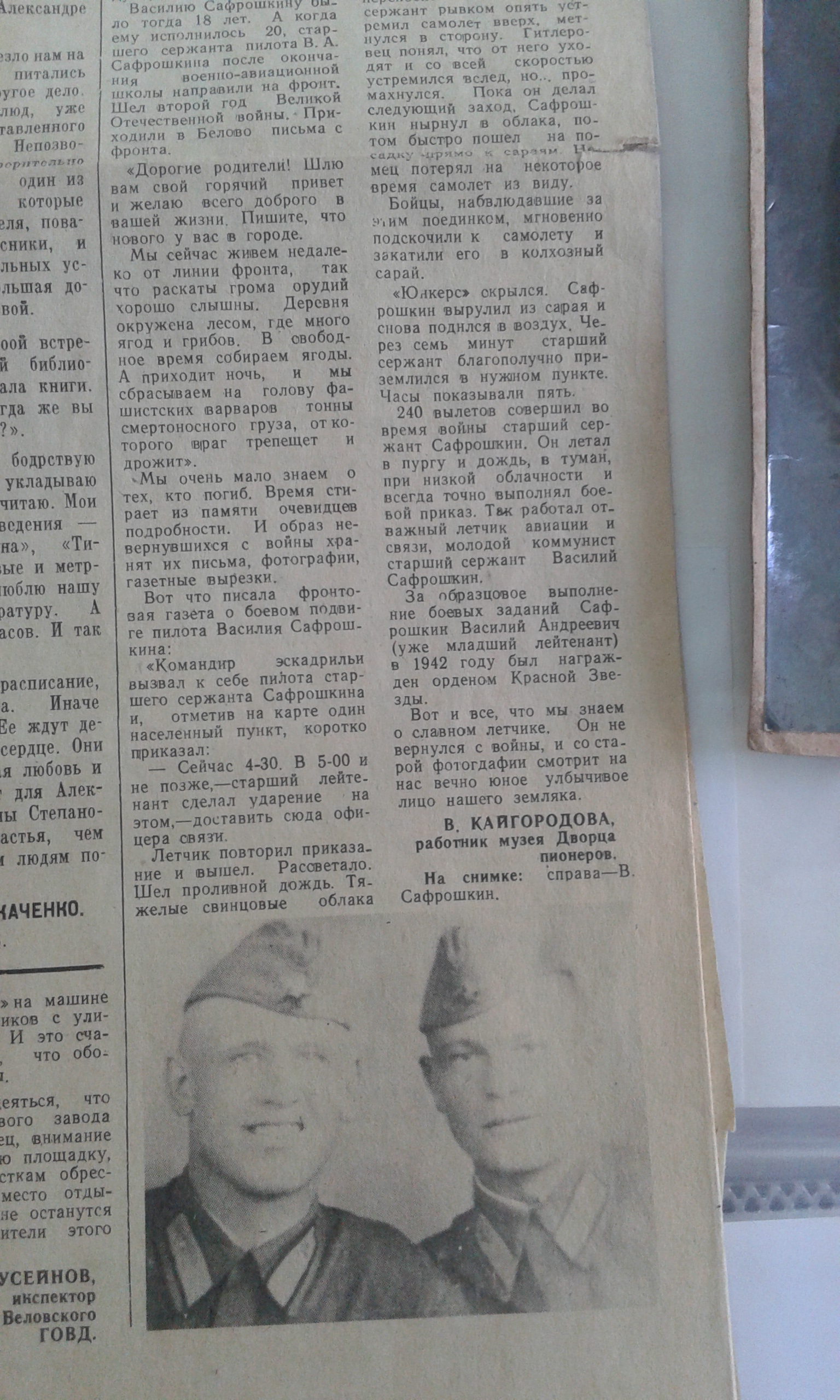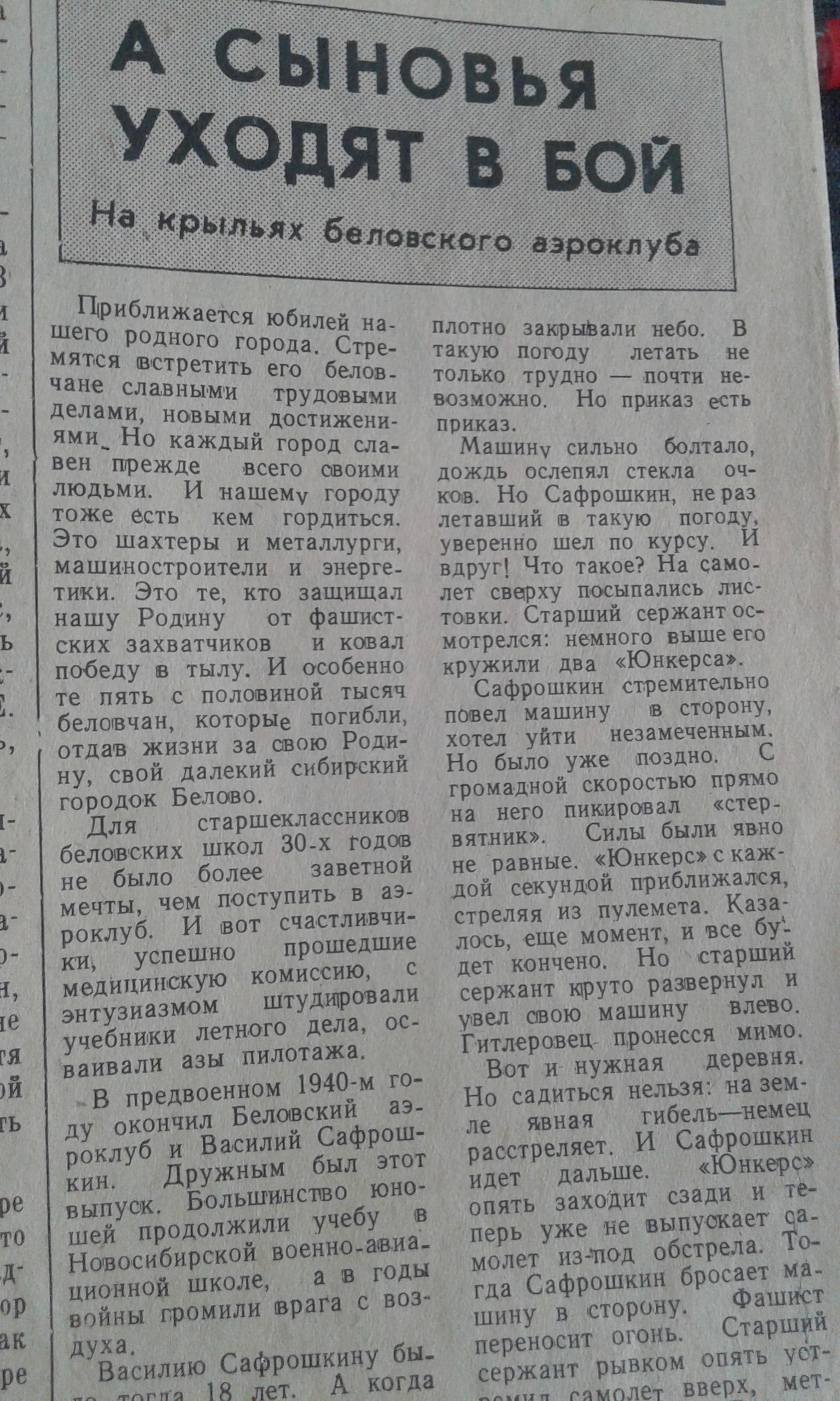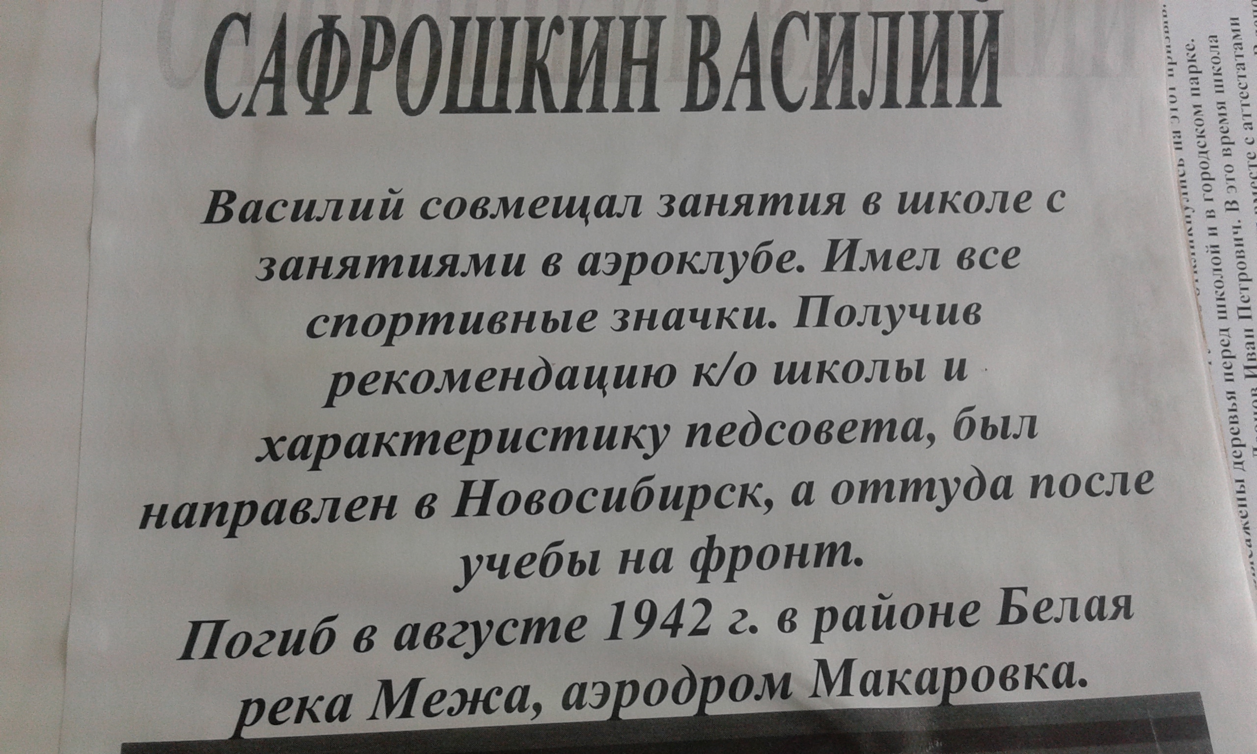 Сафрошкин Василий родился в 1924 году в городе Белово и проживал с родителями на ул. Сталина 190 (сейчас ул.Каховская). В семье было 6 детей (один ребенок умер в младенчестве) из них 4 сына и одна младшая дочь. Отец Василия Сафрошкин Андрей Андреевич был портным, мать Сафрошкина Мария Артамоновна занималась воспитанием детей и управлялась по хозяйству (держали корову и поросят). Зажиточными не были, но всего хватало. Василий учился в школе № 187 и будучи страшеклассником мечтал поступить в Беловский аэроклуб. Его мечта сбылась, он прошел мед.комиссию, поступил и успешно окончил там учебу. Затем продолжил учиться в Новосибирской военно-авиационной школе. В 20 лет после окончания школы был призван на фронт в звании ст.сержанта. В 1942 г. был награжден орденом Красной Звезды. Точное место и дата смерти не известны, ведь "у лечтиков нет могилы" это произошло в районе Белая река Межа аэродром Макаровка.