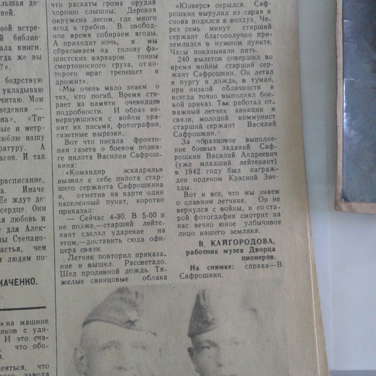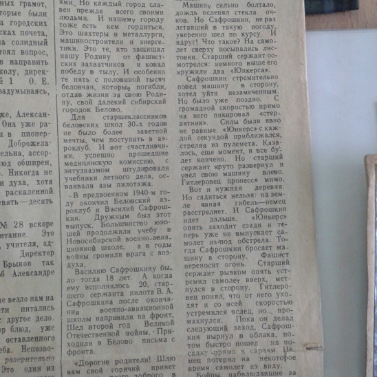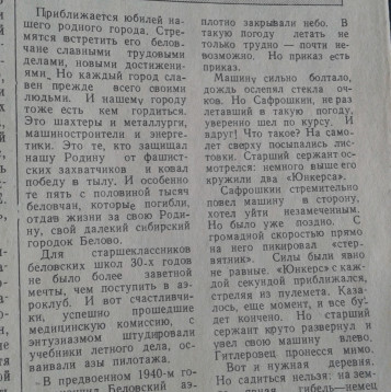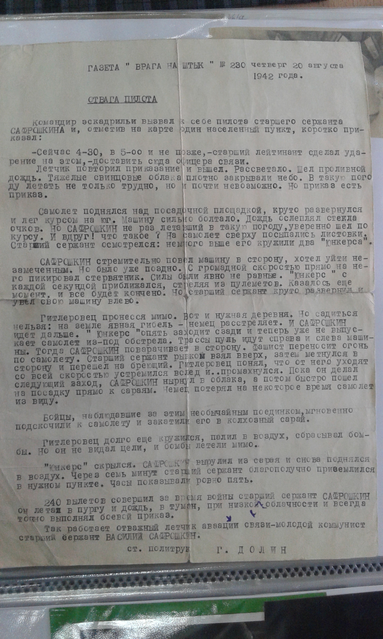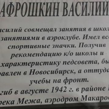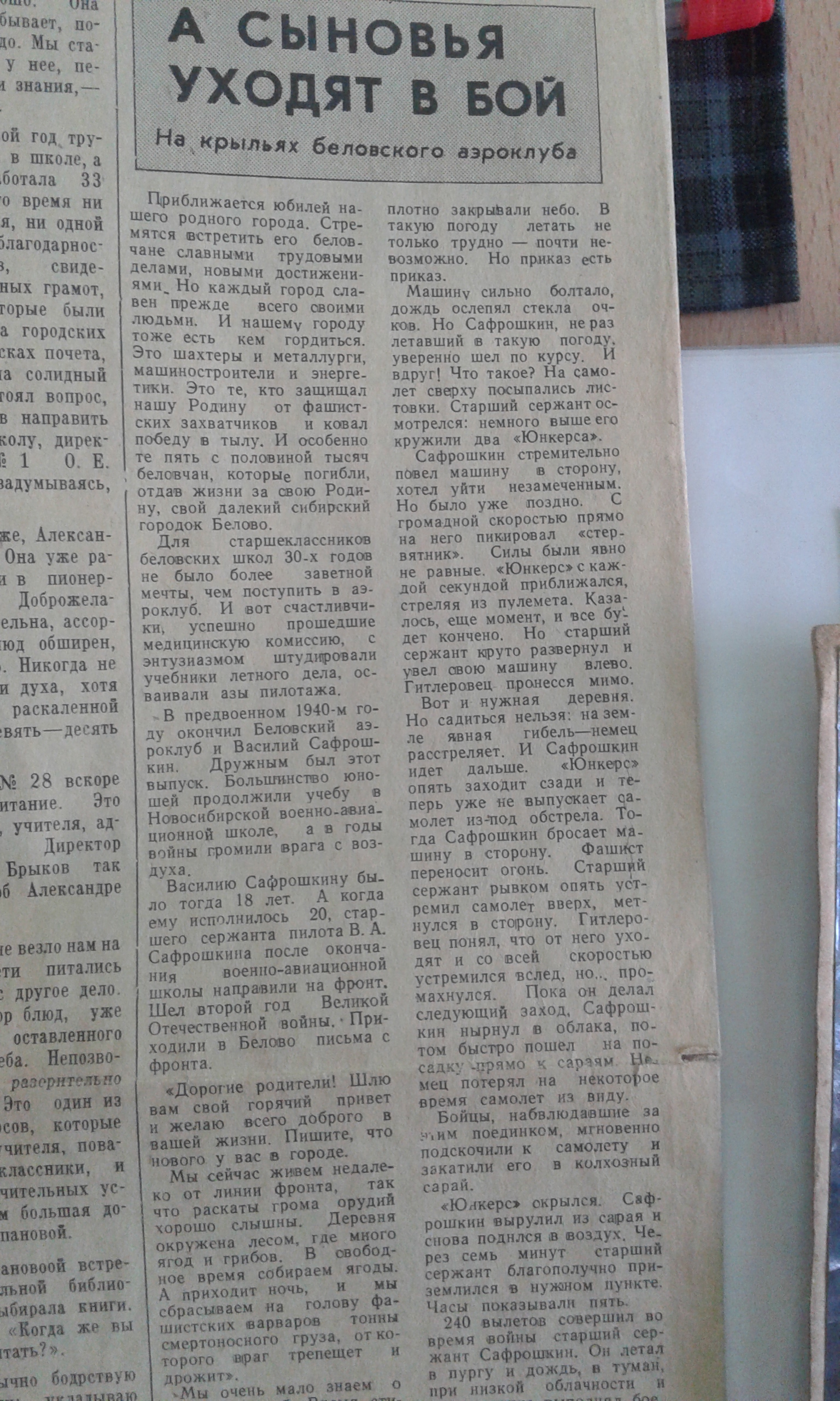Сафрошкин Василий родился в 1924 году в городе Белово и проживал с родителями на ул. Сталина 190 (сейчас ул.Каховская). В семье было 6 детей (один ребенок умер в младенчестве) из них 4 сына и одна младшая дочь. Отец Василия Сафрошкин Андрей Андреевич был портным, мать Сафрошкина Мария Артамоновна занималась воспитанием детей и управлялась по хозяйству (держали корову и поросят). Зажиточными не были, но всего хватало. Василий учился в школе № 187 и будучи страшеклассником мечтал поступить в Беловский аэроклуб. Его мечта сбылась, он прошел мед.комиссию, поступил и успешно окончил там учебу. Затем продолжил учиться в Новосибирской военно-авиационной школе. В 20 лет после окончания школы был призван на фронт в звании ст.сержанта. В 1942 г. был награжден орденом Красной Звезды. Точное место и дата смерти не известны, ведь "у лечтиков нет могилы" это произошло в районе Белая река Межа аэродром Макаровка.