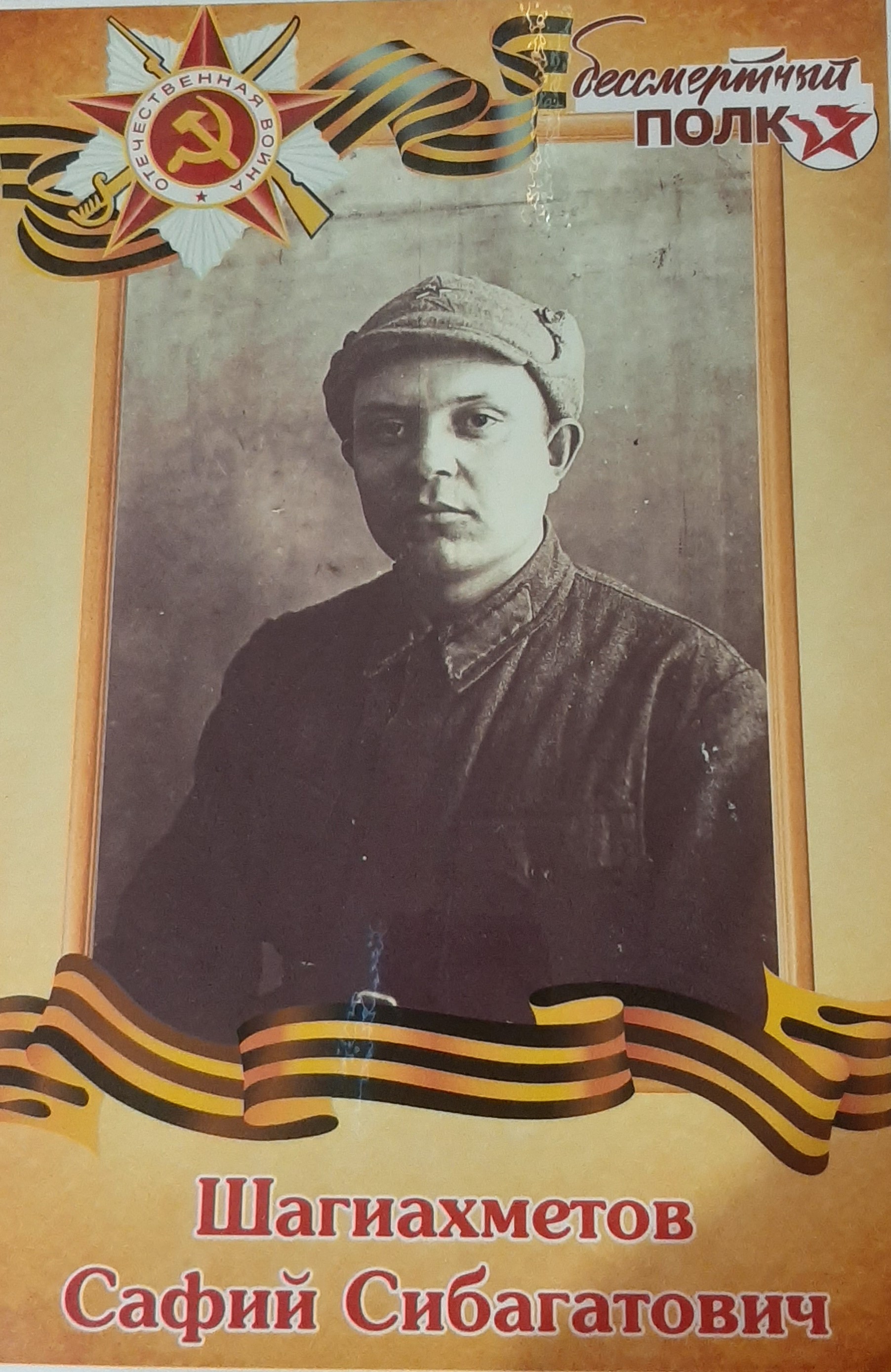 Мой дедушка Сафий Сибагатович был женат на моей бабушке Асие Сибагатовне, имели четверых детей. Призван Орским РВК Чкаловской (сейчас - Оренбургской) области 15 марта 1943 года, ушел на фронт, когда моему папе было 2 годика. Был ранен 04.11.1944. Погиб 14.01.1945. Награжден орденом "Отечественной войны III степени", медалями "За боевые заслуги", "За отвагу".