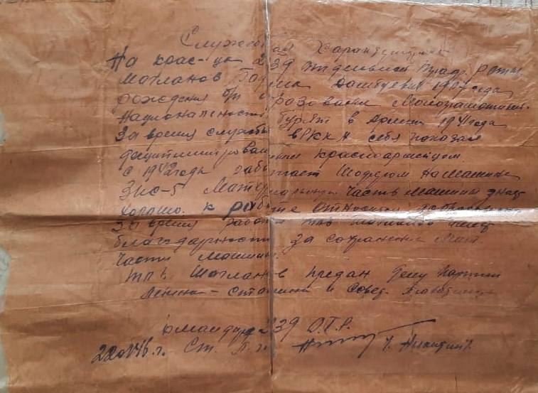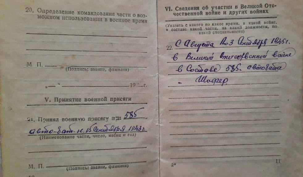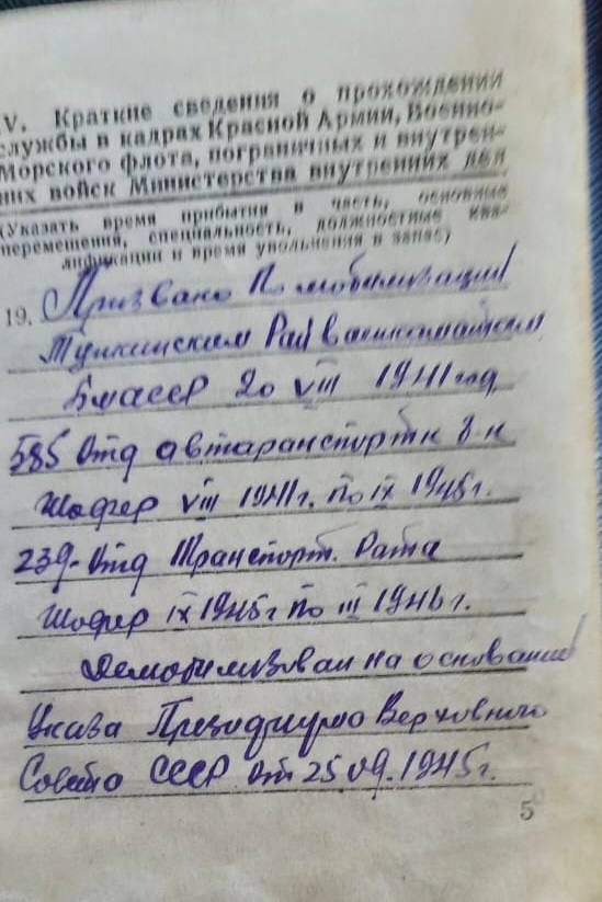 С 20.08.1941 года по 25.09.1945 года участвовал в Великой отечественной войне в звании "рядовой" в качестве шофера 585 отдельного автотранспортного батальона, 239 отдельной транспортной роты.