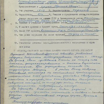 Боевой путь ветерана в РККА с 09.1941 года. Место призыва: Еланский РВК, Сталинградская обл., Еланский р-н. Место службы - 43 инженерно-сапёрная бригада ордена Кутузова Воинское звание - сержант В числе наград: Медаль «За боевые заслуги», Орден Отечественной войны II степени, орден "Красной Звезды"