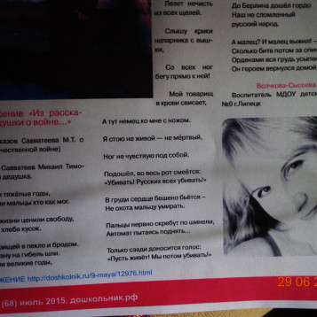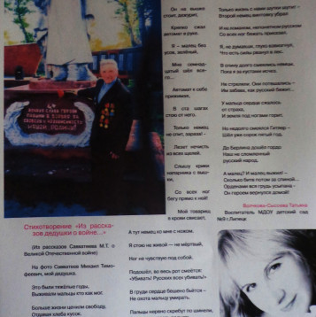 « … Победа! – какое же это сладкое слово было для нас! Как узнал о Великой Победе? – Да наверно, как и миллионы других людей – услышал по радио. Что у нас началось! Это не передать словами! Девчушки-радистки сразу сняли форму, надели платья, и понеслись пляски! Музыка, смех… и слёзы радости! Это незабываемые минуты!..Сердце их хранит до сих пор!..»