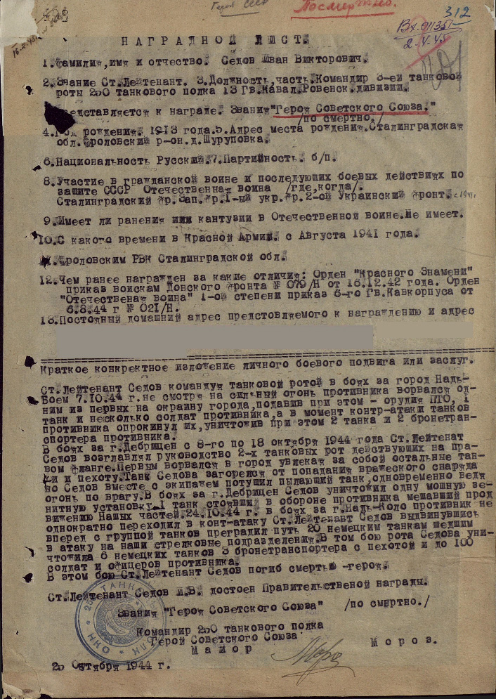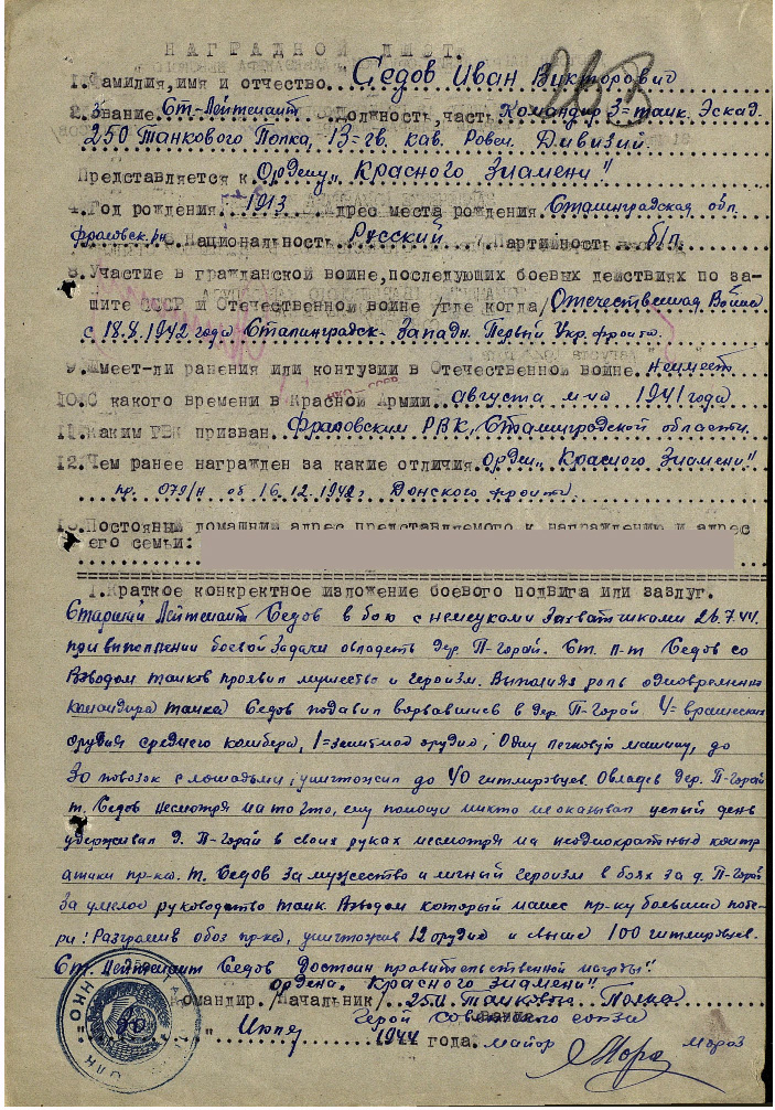 Иван Седов родился 11 декабря 1913 года на хуторе Шуруповский (ныне — Фроловский район Волгоградской области). После окончания четырёх классов школы работал на машинно-тракторной станции. В 1937—1939 годах проходил службу в Рабоче-крестьянской Красной Армии, окончил курсы младших воентехников. В августе 1941 года Седов повторно был призван в армию и направлен на фронт Великой Отечественной войны[1].С 23 по 24 ноября 1942 года командир танка 310 танкового батальона 109 танковой бригады лейтенант Седов со своим экипажем принимал участие в трех атаках в районе хутора Вертячий. Искусно маневрируя на поле боя, примеряясь к местности, вышел впереди группы танков и по радио корректировал огонь остальных танков, находящихся на поле боя, находясь в танке более 20 часов. К концу дня 24.11.1942 года достиг рубежа, что в полкилометра северо-западнее Вертячего. В трех атаках уничтожено 7 орудий, 5 пулеметов, 2 ДЗОТ, 90 солдат и офицеров. Приказом войскам донского фронта от 16.11.1942 г. от имени Президиума Верховного Совета Союза ССР, за образцовое выполнение боевых заданий Командования на фронте борьбы с немецкими захватчиками и проявленные при этом доблесть и мужество лейтенант Седов Иван Викторович награждён орденом «Красного Знамени». Старший лейтенант Седов Иван Викторович приказом шестому гвардейскому кавалерийскому корпусу от 6.08.1944 г № 021/ Н награждён Орденом «Отечественной Войны Первой степени». Из наградного листа известно о подвиге следующее: "в бою с немецкими захватчиками 26.07.1944 г. при выполнении боевой задачи овладеть деревней П-Горой, выводя танки, проявил мужество и героизм. Выполняя функцию одновременно командира танка Седов подавил, ворвавшись в деревню, 4 вражеских орудия среднего калибра, 1 зенитное орудие, одну легковую машину, до 30 повозок с лошадьми, а также уничтожил до 40 гитлеровцев. Овладев деревней П-Горой, товарищ Седов, несмотря на то, что ему помощи никто не оказывал, целый день удерживал д. П-Горой в своих руках, несмотря на неоднократные контратаки противника. Седов за умелое руководство танком, который нанес противнику большие потери: разгромил обоз противника, уничтожил 12 орудий и свыше 100 гитлеровцев.К октябрю 1944 года старший лейтенант Иван Седов командовал ротой 250-го танкового полка 13-й гвардейской кавалерийской дивизии 6-го гвардейского кавалерийского корпуса 2-го Украинского фронта. Отличился во время освобождения Венгрии. 24 октября 1944 года рота Седова во время боя за венгерский город Надькалло приняла бой с 20 танками противника, подбив 6 из них и заставив остальные отойти. В том бою Седов погиб. Похоронен на площади в венгерском городе Балкани. Из ответа на запрос от Фроловского военкомата к Венгерскому Красному кресту известно, что после войны останки советских воинов, захороненных в д. Балкань, были перезахоронены на советском воинском кладбище в городе Ньиредьхаза.Указом Президиума Верховного Совета СССР от 28 апреля 1945 года старший лейтенант Иван Седов посмертно был удостоен высокого звания Героя Советского Союза. Также был награждён орденами Ленина, Красного Знамени и Отечественной войны 1-й степени[1].