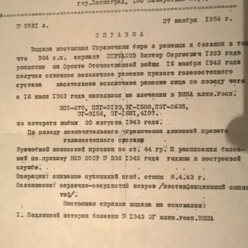 Мой дед. Шершаков Виктор Сергеевич,родился в г.Ельня Смоленской области.В 1941 году с отличием окончил школу,и поступил в основанную в 1940 году Военно-Морскую Медицинскую Академию (позже ВВММА),в г. Ленинград.Войну встретил в военно-полевом лагере академии,в составе созданной из курсантов части был отправлен во 2-й эшелон обороны города, в район Гостилиц.Также курсанты несли караульную службу,дежурили на крышах.Курсанты участвовали в боях и обороне,в промежутках учились.В декабре 1941 приказали эвакуировать академию в г.Киров.Эвакуировались курсанты своим ходом, Через Ладогу на Кабоны.Стройная система эвакуации была нарушена взятием немцами г.Тихвин, но с активным участием курсантов, дня через 3-4 враг был выбит из города и путь продолжился.По понятным причинам,до Кирова добрались не все,академия растянулась во времени и пространстве.Кто попал в госпиталь,кто заблудился и т.д. В разные сроки основная масса курсантов 1го и 2го курсов до Кирова добрались,и в июне 42го дед закончил 1й курс. В июле 1942 года,курсантов направили для укомплектования 252 стрелковой дивизии, и отправили под Сталинград,в состав 65 армии Донского фронта.... На тот момент дед уже был сержантом, и командиром отделения роты автоматчиков.Участвовал в операции ,,Урал,, . приведшей к окружению Сталинградской группировки немцев. 19 ноября 1942 года, в момент наступления по окружению немецкой группировки, дед был тяжело ранен. Потом был госпиталь в Фергане, и признание годным к нестроевой службе. В 1943 году он продолжил обучение в Высшей Военно-Морской Медицинской Академии. Закончил её в 1947 году и проходил службу на кораблях Балтийского флота, на медицинских должностях. С 1960 года проходил службу в лечебных учреждениях Балтийского флота на должностях врача-рентгенолога и начальника учреждений. С 1972 года служил начальником санатория ВоенноМорскогоФлота ,,Майори,, в г.Юрмала. в 2003 году умер, и похоронен в г.Юрмала, Латвия. Светлая память!!!