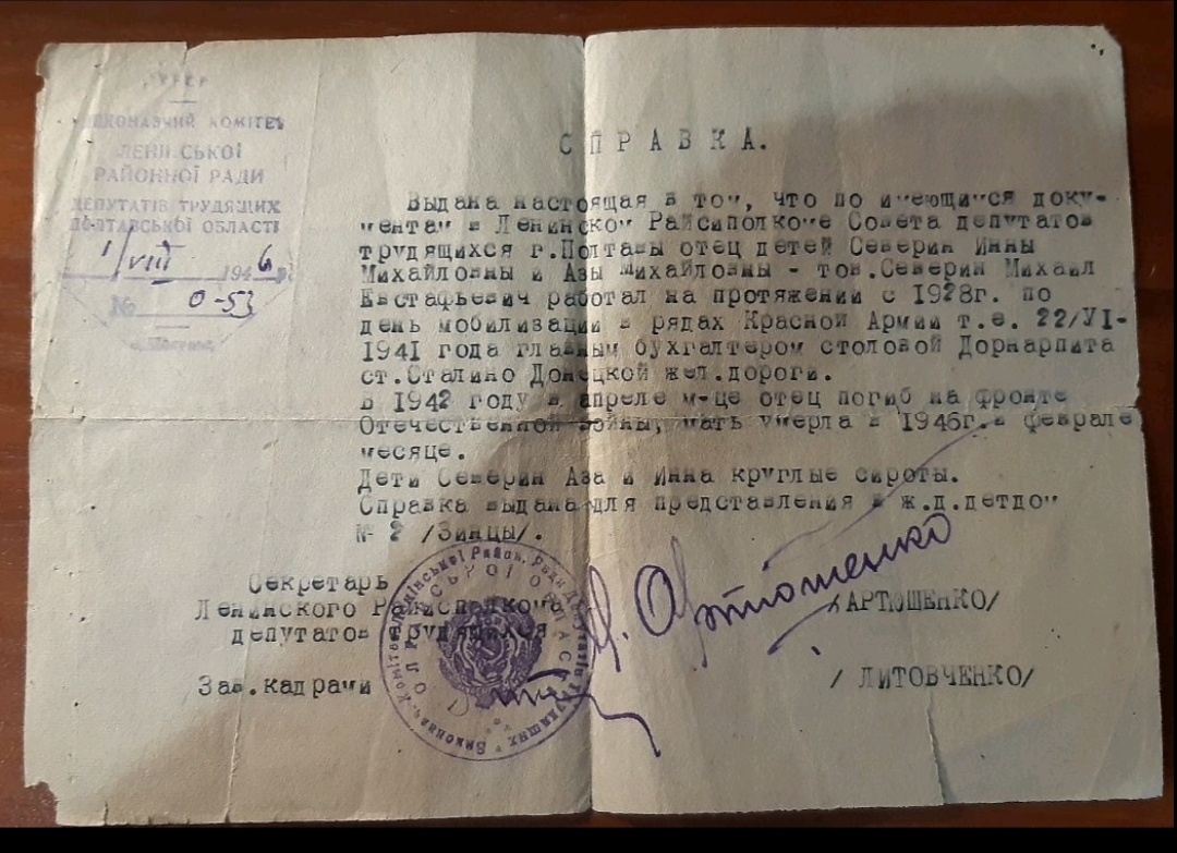 У моей бабушки Наталии не было дедушки. Ни одного. Её дед по папиной линии – Василий Николаевич Крюков – погиб на войне, сведений о нем очень мало. Семья моего прадедушки Александра – он, его мама и четверо братьев ¬– были эвакуированы из Ленинградской области в город Тюмень, где и прожили всю жизнь. Прабабушка Инна тоже рано потеряла отца. Они с родителями и младшей сестрой Азой жили в Донецкой области, городе Амвросиевка, и когда началась война, ей было только пять с половиной лет, а ее сестре Азе – два. Её папа Северин Михаил Евстафьевич с 1928 года работал главным бухгалтером столовой Дорнарпита с.Сталино Донецкой железной дороги. Его призвали в ряды Красной Армии 22 июня 1941 года. Моя мама говорит, что её бабушка Инна рассказывала, что помнит, как они с сестрой и мамой несколько дней ходили на свидание с папой к эшелонам, которые готовили к отправке на фронт. С войны он не вернулся, похоронки не было, он числился пропавшим без вести, пенсию по потере кормильца прабабушка Инна и ее сестра после войны не получали. Их мама Анастасия Андреевна заболела после того, как во время оккупации немцы выгнали ее зимой на работу, не дав одеться. Она умерла от туберкулеза в феврале 1946 года, а прабабушка с сестрой попали в детский дом. Всю жизнь они ничего не знали о судьбе своего отца, пытались разыскивать его, писали запросы в архивы, но тщетно. Прабабушка Инна умерла в 2009 году, а в 2015 году при посещении Диорамы «Курская битва. Белгородское направление» при помощи сотрудника музея моя мама разыскала в Книге памяти информацию о моем прапрадеде. Старший сержант Северин Михаил Евстафьевич погиб в бою 12 апреля 1942 года в д.Зайцева гора Барятинского района Смоленской области. Захоронен на одноименном Мемориальном комплексе, сейчас это территория Калужской области. Если ввести в строке поиска «Зайцева гора», интернет выдает множество статей под названиями: «Самая кровавая высота Великой Отечественной», «Самое гиблое место Великой войны», «Трагедия Зайцевой Горы». Дальнейшая историческая справка необходима для полноты понимания трагедии нашей семьи. «В конце 1941 года 50-я армия генерала Болдина Ивана Васильевича, героически отстоявшая Тулу, а потом освободившая Калугу, вышла к Варшавскому шоссе, по которому немцы поставляли припасы и подкрепления для своей юхновской группировки. Тут 50-я армия наткнулась на оборону в самой высокой точке (275 м) нынешней Калужской области — на Зайцевой горе. На самом деле это пара высот и деревень на них — высота 269,8 (Фомино-1) и высота 275,6 (Фомино-2). До войны Зайцевой горой называлась только последняя, но солдаты распространили название на всю местность. Получив приказ перерезать проходящее между высотами Варшавское шоссе, генерал Болдин изучил поле предстоящего боя и сообщил Жукову свой вердикт: это мышеловка. Ему повторили приказ: Зайцеву гору взять. 12 апреля 1942 года первой на гору пошла 146-я стрелковая дивизия генерал-лейтенанта Новосельского. Сначала бойцы под обстрелом проложили путь через Шанино болото (50 квадратных километров), то и дело проваливаясь по пояс в ледяную жижу. За несколько дней дивизия Новосельского перебралась через Шанино болото, под прикрытием снежных валов перегруппировалась и пошла в свою первую атаку на Зайцеву гору. Их было 11 284 человека. Через несколько дней на переформирование в тыл отвели 3976 