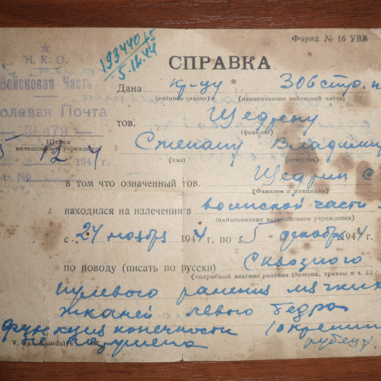 Боевой путь ветерана Щедрин Степан Владимирович родился 2 августа 1919 г. Место рождения: Рязанская область, Ижевский район, деревня Воскресеновка В годы великой отечественной войны служил в 306 стрелковом полку. С 1942-1944гг. находился в плену. 7 сентября 1944г. получил пулевое ранение в наступательном бою. Лечился в госпитале воинской части 36479. Погиб 2 августа 1954 года во время грозы от удара молнии, в родной деревне.