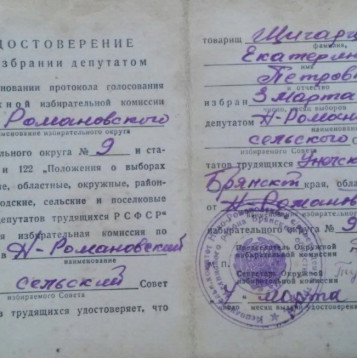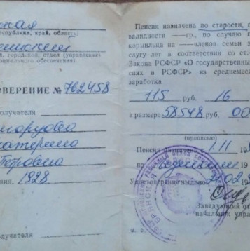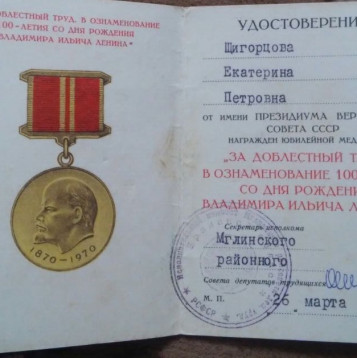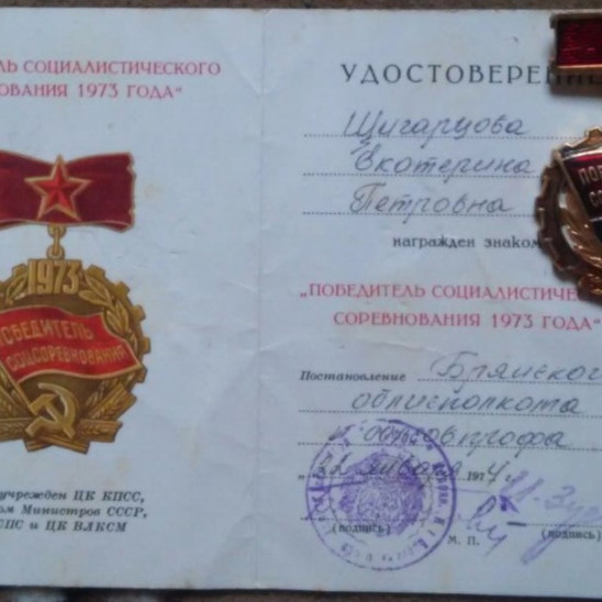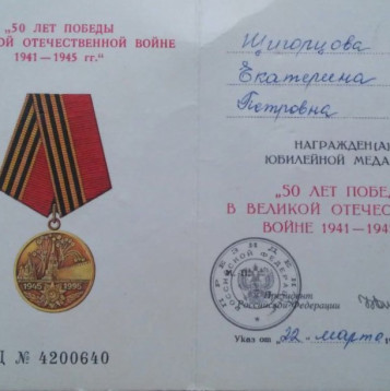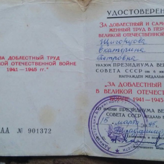 мог на себе принести ребенок. Да и все эти веточки сгорали быстро, а тепла от них было не так много, поэтому в лес приходилось ходить каждый день. Да и работу в колхозе никто не отменял. Нужно было ухаживать за животными. Все время, до самых заморозков, ходили босиком. Из одежды была юбка и какая-нибудь кофточка, которая от худобы висела как на колышках. У всех и у детей и у взрослых жизнь была одинаково тяжелой. Да и не было такой категории, как ребенок. Все были колхозниками, помощниками фронта. И никаких поблажек детям не делалось. Все домашние дела старались сделать на рассвете, так как в пять утра нужно было идти на колхозные поля: сажать, полоть, убирать урожай или заготавливать сено или другие корма для животных на зиму. Пока в поле сено не убрали, никто не уходит. Работали с рассвета и до позднего вечера. А за всю эту работу денег не платили, а ставили только трудодни и давали кое-какие продукты. Дети участвовали в посевных работах, занимались заготовкой зерна, заготовкой сена, работа на ферме, на лесозаготовках не обходились без них. Да, наверное, и нет такого труда в колхозе, где не работали дети. А после войны работать стало не легче, но радостнее. От мысли, что все это закончилось, что мы победили, хотелось работать с удвоенной силой. В фронта не вернулся отец. Его убили в 1944году. В первый год войны умерла младшая сестра Настенька, которой было чуть больше годика. Все это оставило неизгладимый след в жизни моей прабабушке. Как самая старшая из детей она всю жизнь чувствовала ответственность за своих младших братьев. Всю жизнь с ней жила ее мама, о которой она заботилась до последних дней. Чувство ответственности и заботы о всех кто ее окружает, несоизмеримая любовь к труду и бережливости не только своего, но и колхозного навсегда осталось с ней. Екатерина Петровна всю свою жизнь проработала в колхозе «Авангард» в родном селе. Ее трудный трудовой путь начался в 13 лет и продолжался всю ее жизнь. Она работала и в поле, была бригадиром, работала заведующей свинофермы, избиралась депутатом сельского совета, имеет много наград, среди которых «Победитель социалистического соревнования», медаль «За доблестный труд в Великой Отечественной войне 1941-1945 гг.», Имеет звание «Ветерана труда» и другие награды. В 1994 году ушла на пенсию, проработав в колхозе более 50 лет.