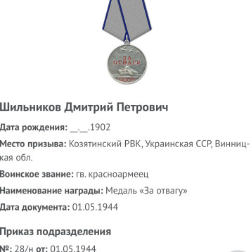 Дмитрий Петрович, родился 24 декабря 1902 года в селе Панихинский. 4 класса образование, всю жизнь с детства проработал в колхозе. Но как родин звала на помощь он шёл добровольцем на фронт. Первый его боевой опыт был в Советско-Финском конфликте. Где он всю зиму просидел в Карельских болотах. А во-второй раз, его Родина позвала на защиту от немецко-фашистки захватчиков. Дмитрий Петрович был призван в Козятинский РВК, Украинская ССР, Винницкая области. В 1942 году в звании сержанта. И попал в 19 стрелковую бригаду Украинского фронта. Но его путь был не легки и в одном из боёв в Смоленской области, Сухиничский р-н, под деревней Казарь получил ранение и был госпитализирован. За этот бой он получил Медал «За отвагу». После выздоровления был комиссован и в 1944 году вернулся домой. Все документы находятся в: ЦАМО, шкаф 98, ящик 13.