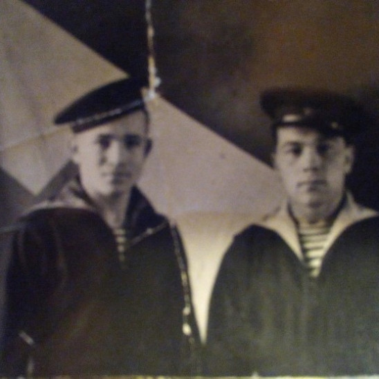 сфотографирован перед развернутым знаменем корабля Краснознаменного Эм "Войков"