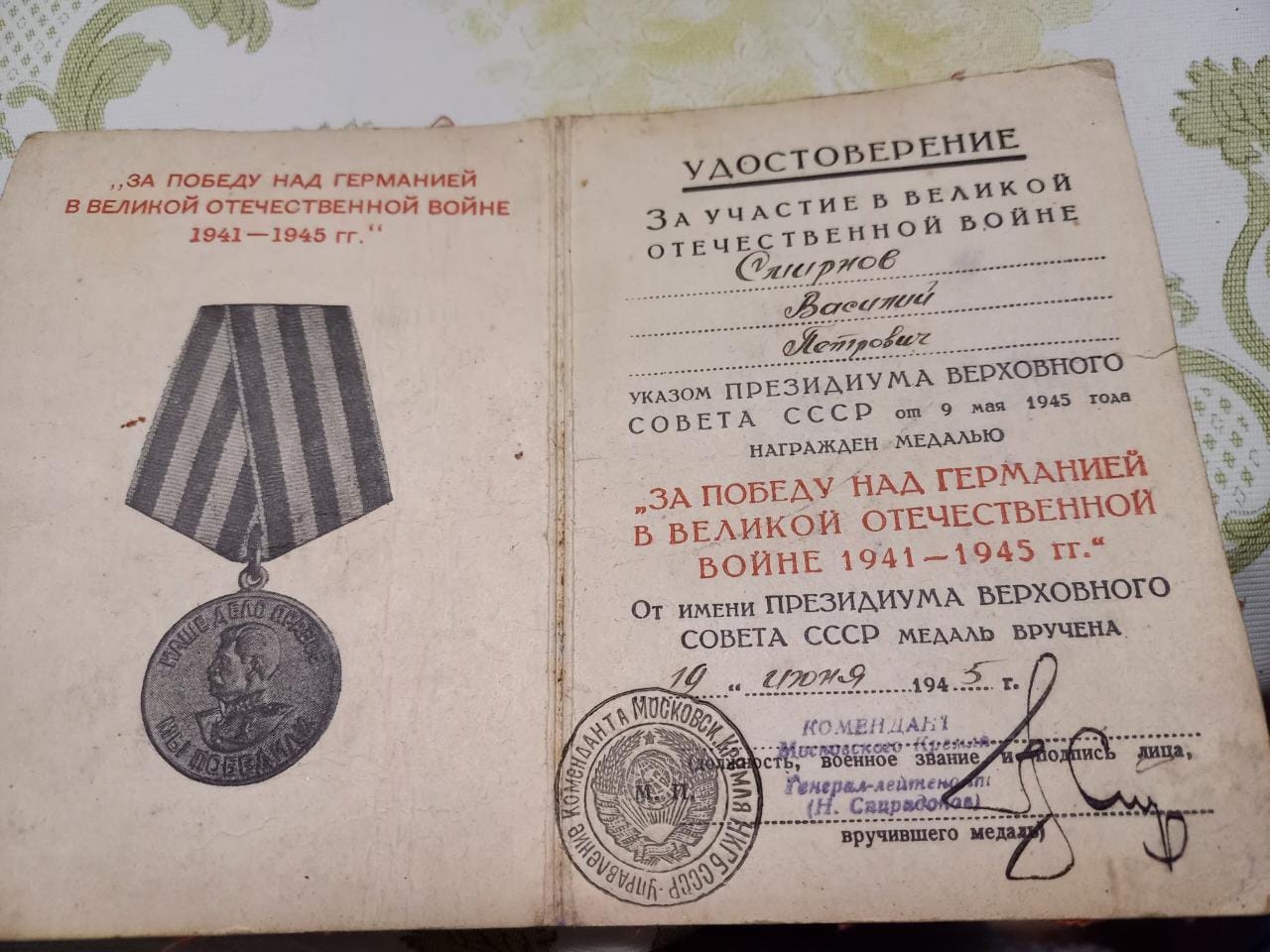 Незадолго до Парада Победы, 19 июня 1945 года мой прадед Смирнов Василий Петрович получил медаль «За победу над Германией в Великой Отечественной войне 1941-1945 гг.». На самом же Параде Победы он принимал непосредственное участие, а именно: он бросал фашистские штандарты к Мавзолею В.И. Ленина.