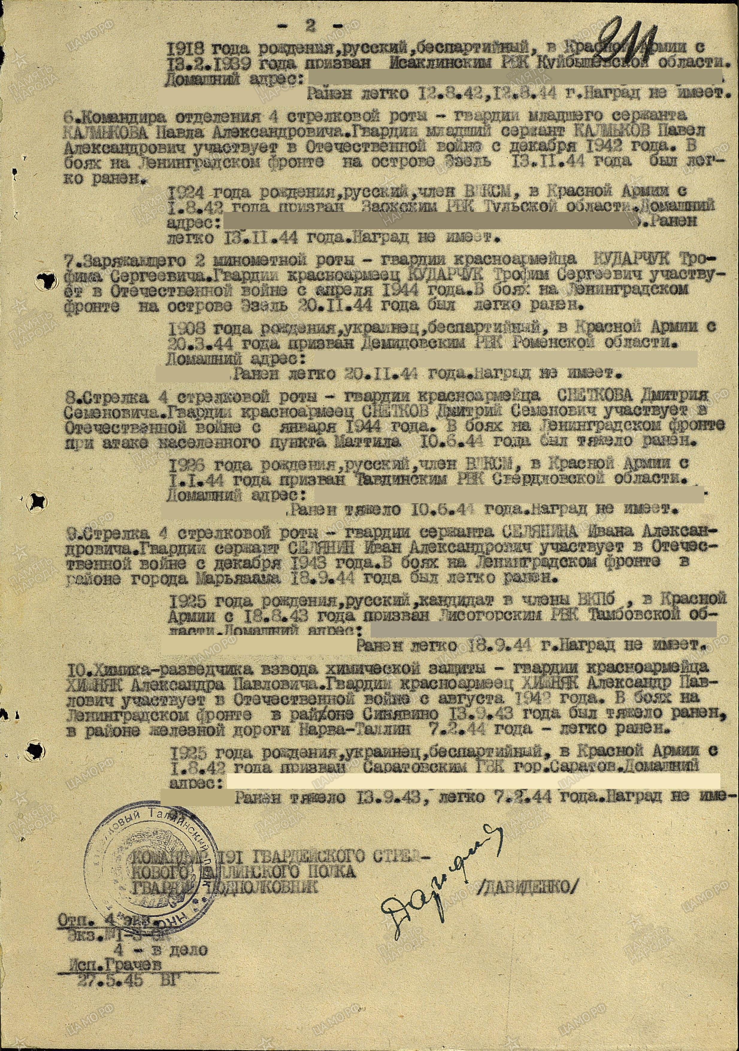 СНЕТКОВ ДМИТРИЙ СЕМЁНОВИЧ 1926 г.р.. Уроженец Свердловской области города Тавды. Дядя ДИМА как я его называла, запомнился мне весёлым, добрым человеком. Мои родители были друзьями с семьёй д. ДИМЫ. В живых из его семьи ни кого уже не осталось. Поэтому я решила увековечить его боевые сражения в ВОВ. Помню когда собирались наши семьи по праздникам, дядя ДИМА рассказывал о боях в которых принимал участие. И каждый раз он рассказывал через слёзы. Я всё не могла понять почему дядя ДИМА плачет, но в памяти отложилось на всю жизнь. Дядю Диму призвали из Верхне-Тавдинского РВК Свердловской области, Верхне-Тавдинского района в 1944 году. Место службы в 64-гвардейской стрелковой дивизии, 191-м гвардейском полку Ленинградского фронта. 10.06.1944 года СНЕТКОВ ДМИТРИЙ СЕМЁНОВИЧ гвардии красноармеец в боях на Ленинградском фронте, при атаке населённого пункта МАТИЛЛА был тяжело ранен, награждён медалью "За Отвагу". За то что в период боевой контратаки противника, из автомата уничтожил 3-х финских солдат. 05.01.1969 года награждён Медалью "За победу над Германией в ВОВ 1941-1945"гг. 06.04.1985 года награждён Орденом Отечественной войны II степени. Во время войны встретил свою будущую жену СНЕТКОВУ ЕВГЕНИЮ ПЕТРОВНУ, уроженку города ЛЕНИНГРАДА. Привёз к себе на РОДИНУ. Образовалась семья, родился сын. После войны жил и трудился стропольщиком на Тавдинском лесокомбинате. Умер в 80-х годах. Я горжусь что знала этого человека. ГОРЖУСЬ И ПОМНЮ!!!!!!! ВЕЧНАЯ ПАМЯТЬ ГЕРОЯМ ВОВ !!!!!!!