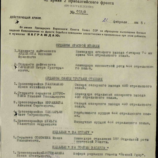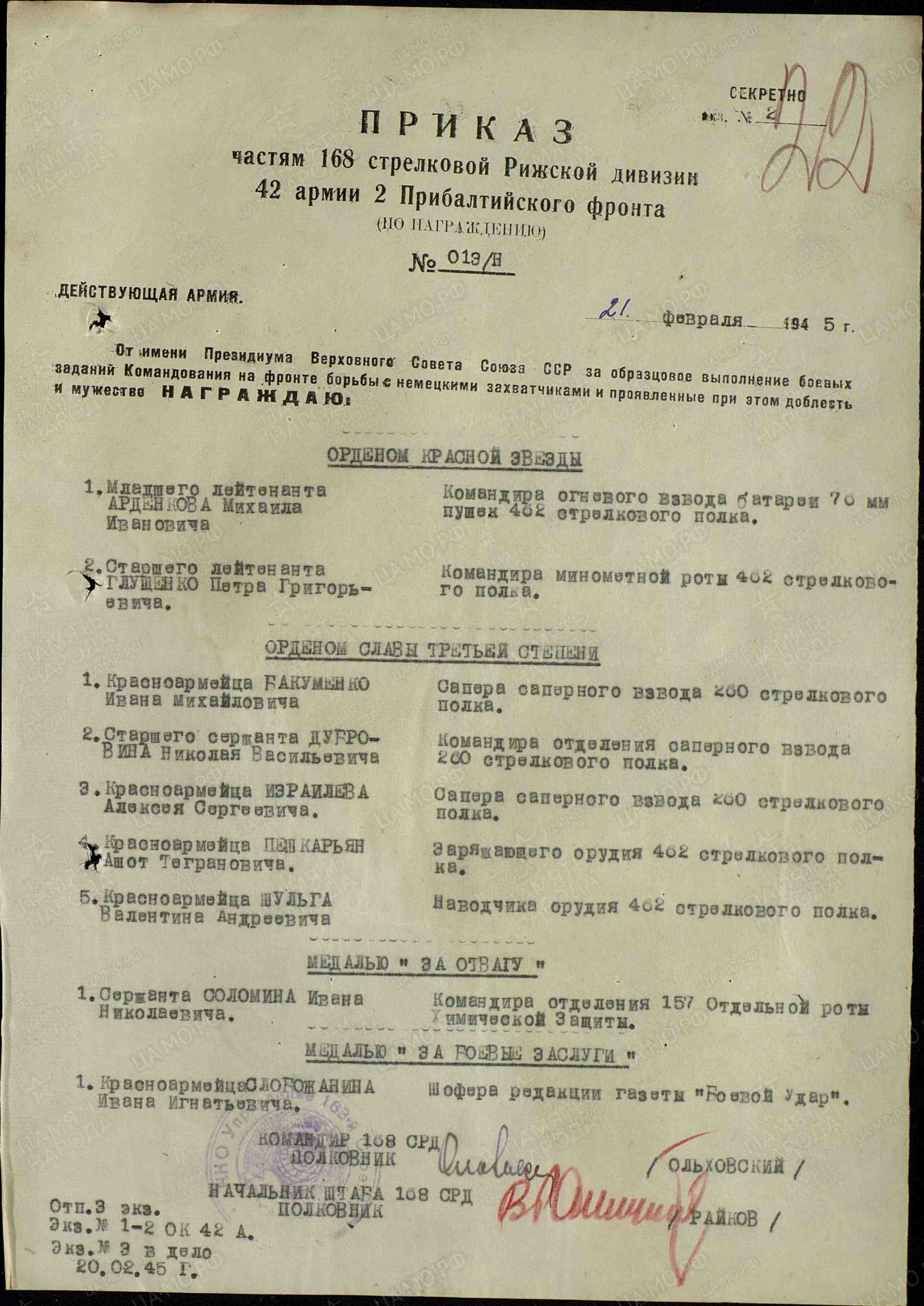 Родился 4 января 1916 года, уроженец с. Зверинец Ростовского района Ярославской области. Социальное положение – крестьянин. Гражданская профессия – кузнец. Военная специальность – стрелок. С апреля 1941 г. проживал в г. Ленинграде, работал на Кировском заводе. В РККА с 22 июня 1941 года, призван Свердловским РВК г. Ленинграда. В начале войны служил в 11 полку аэростатов воздушного заграждения II корпуса ПВО г. Ленинграда. В октябре 1941 г. был направлен на Ленинградский фронт. Воевал на Ленинградском (рядовой 260 стрелкового полка 168 стрелковой дивизии) и II Прибалтийском фронтах (командир отделения 157 Отдельной роты химической защиты 168-й стрелковой Рижской дивизии 42-й армии). Завершил войну в звании гвардии сержанта, в 30 гвардейской Рижской Краснознаменной стрелковой дивизии 10 армии II Прибалтийского фронта. Был дважды тяжело ранен – в декабре 1941 (во время боев за Невскую Дубровку) и в апреле 1942 гг. Награжден медалями «За оборону Ленинграда» (22.12.1942 г.), «За отвагу» (21.02.1945 г.), «За победу над Германией в Великой Отечественной войне» (31.10.1945 г.) Демобилизован из действующей армии 15 января 1946 года. Умер 16 июня 1981 г., похоронен на кладбище д. Кустерь Ростовского района Ярославской области. Уже послу смерти Ивана Николаевича, в 1985 г., за смелость, мужество и отвагу проявленные в годы войны, он был удостоен Ордена Отечественной войны II степени.