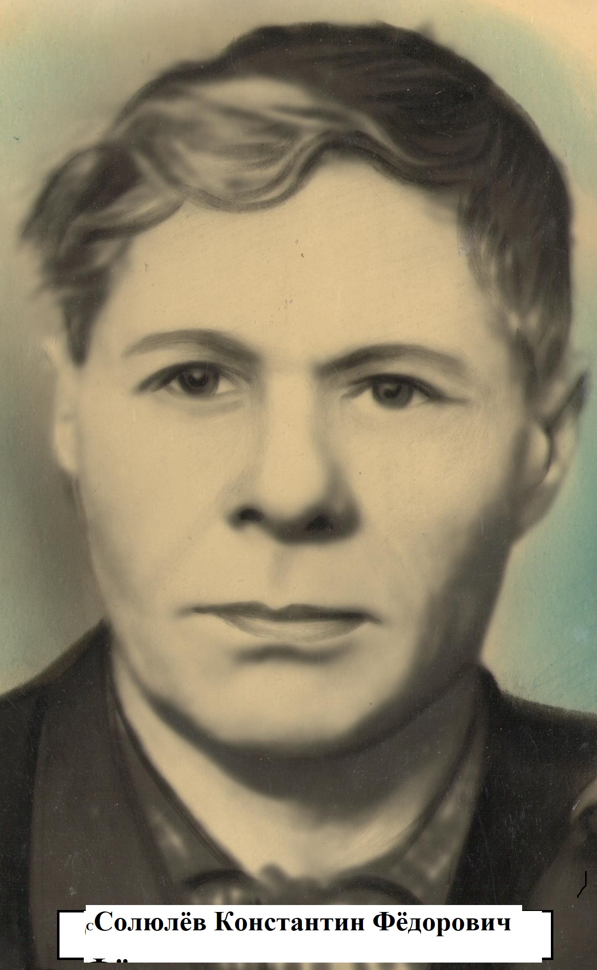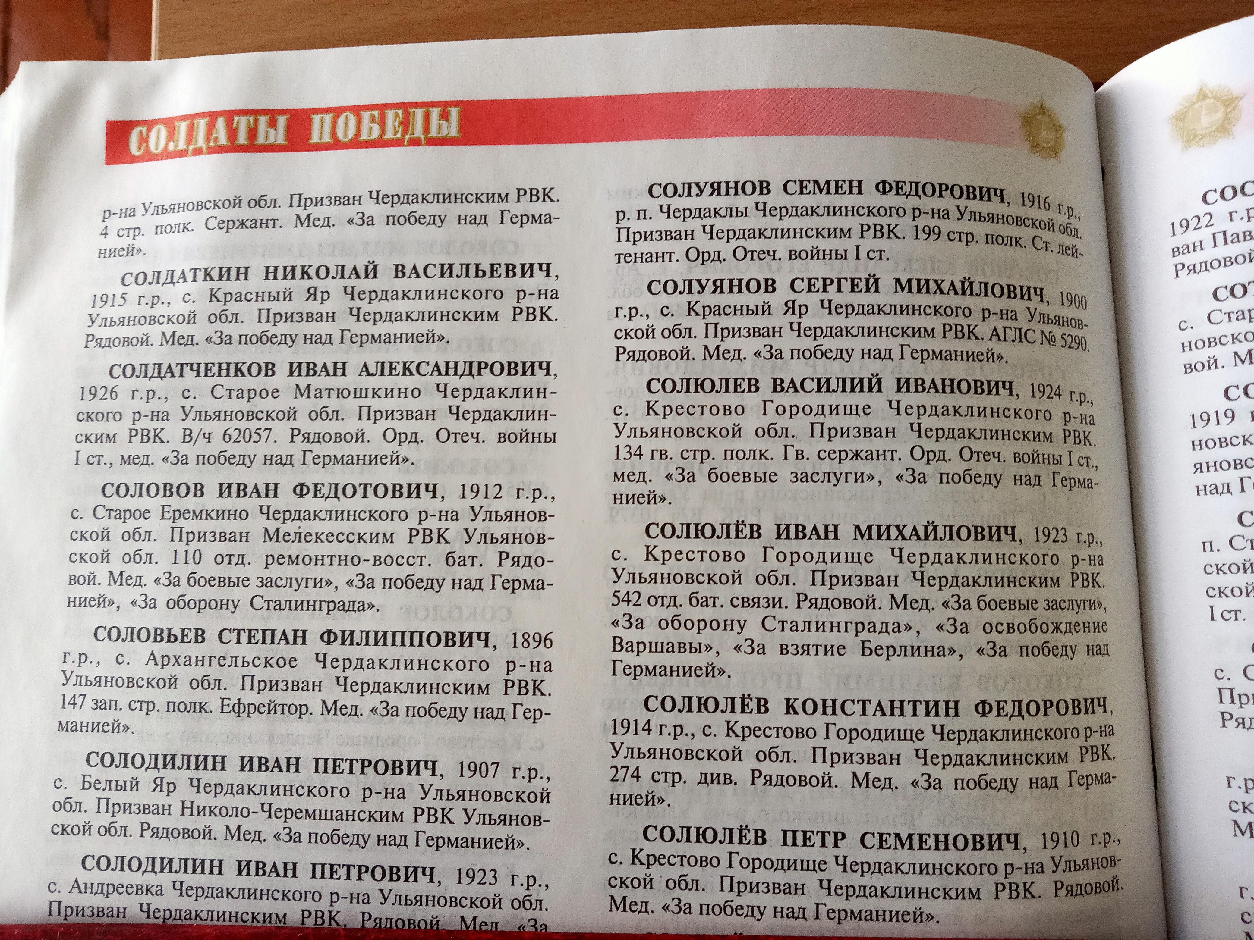 Мой прапрадед Солюлёв Константин Фёдорович родился в селе Крестово-Городище Чердаклинского района Ульяновской области 19.05.1914г. Во время Великой Отечественной войны был призван на фронт Чердаклнским РВК в 274 стр. дивизию в звании рядовой (выписка из Книги "Солдаты Победы"). Он сражался за Москву в 1941 году. Был тяжело ранен в голову (на голове у него был глубокий след от ранения) и в ногу (всю оставшуюся жизнь прапрадедушка хромал). Лежал в госпитале. Награждён "Медалью за Победу над Германией". Я никогда не видела своего прапрадеда, но в нашей семье бережно хранится его фотография. Когда я увидела его фотографию в семейном альбоме, спросила о нём у своей бабушки. Она мне и рассказала о нём. Я очень много думала о прапрадедушке и посвятила ему своё стихотворение. Мой прапрадедушка – мой Герой! Есть в старом семейном альбоме портрет. Смотрит с него незнакомый мне дед. Бабушка мне сказала: Он – Герой! Благодаря ему мы живём с тобой. Твой прапрадедушка воевал под Москвой. На войне он был ранен, но вернулся живой. - Как его звали? - я хотела узнать. - Прапрадедушка Костя, а мы звали тятя. - Расскажи мне, бабушка, про него, Расскажи, что знаешь про прапрадеда моего. - Он был ранен, внученька, тяжело. На голове был шрам глубокий у него. Я шутила: «Тятя, дырку покажи!» Он смеялся: «Ну-ка, внучка, пальчик приложи». - Ух, какая дырка большая у тебя! – Веселилась маленькая бабушка моя. Грустно улыбался прапрадеда мой. Добрый, смелый, старенький прапрадед мой – Герой! После ранения прапрадедушка хромал – Фашист ему пулей в ногу попал. - Мой прапрадеда Костя, тятя мой, Пусть я никогда не виделась с тобой, Я тебя жалею, я тебя люблю, Я тебе спасибо, тятя, говорю. И детям, и внукам о тебе расскажу, И портрет в альбоме твой покажу. Будет, тятя, помнить тебя моя семья И гордиться будет, как горжусь я! В «Бессмертном полку» я пойду с тобой. Ты – мой защитник, ты – мой Герой! Верю, ты услышишь, дедуля, голос мой. Я о тебе помню, ты – мой Герой! 9 мая я с волнением и гордостью несла портрет своего прапрадеда в Бессмертном полку. Я прижимала его фотографию к груди, на глаза набегали слёзы. В этот момент я чувствовала, что он рядом, как живой! А мой младший брат нёс фотографию нашей прапрабабушки Солюлёвой Агриппины Михайловны. Я горжусь своим прапрадедом, он защищал нашу столицу Москву! Защищал свою страну и свою семью ценой своего здоровья, рискуя жизнью. Я благодарна моему дорогому прапрадедушке за то, что он вернулся живой и в 1946 году у него родился сын Александр - мой прадед. Ведь фашисты убили миллионы советских людей, но у них не родились миллионы детей, внуков и правнуков! Прадедушка Костя умер 19 августа 1978 года, прожив 64 года. Со своей женой Агриппиной Михайловной родили и воспитали 2 детей. У них 5 внуков, 5 правнуков и 6 праправнуков. Бабушка говорила, что дедушка не рассказывал о войне, наверное, тяжело было вспоминать. А вот мы, праправнуки, правнуки, внуки и дети победителей не можем, не должны забывать о своих героях, их великом Подвиге! Мы не хотим, чтобы ужас войны повторился.
