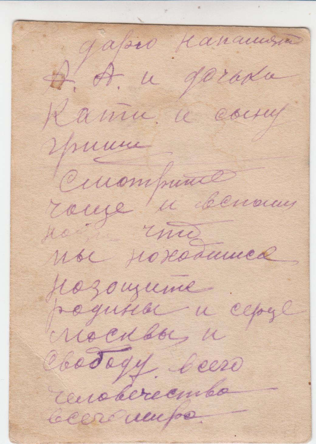 Мой дед Михаил Яковлевич Сорокин участвовал в Битве за Москву сначала в составе 32 армии Западного фронта, а затем, с января 1942 года в составе 237 танкового полка Калининского фронта, о чем свидетельствуют записи в его красноармейской книжке и в военном билете. В период Московской битвы Михаил Яковлевич спасал раненых, вытаскивал их с поля боя вместе с оружием, оказывал первую медицинскую помощь, дрался в рукопашном бою. Дед Михаил родился в октябре 1905 года в селе Романово Панкрушихинского района Алтайского края. Растил детей, крестьянствовал, плотничал… Его мирная жизнь была прервана 22 июня 1941 года, 26 июня принял присягу. Впереди было много тяжелейших испытаний: Московская битва; «Ржевская мясорубка» в «долине смерти" у д. Рамино в августе 1942; Северный фас Курской дуги под Ольховаткой и танковый удар на Харьков; Бои за западную Украину; Взятие Будапешта в 1945 году. Было несколько ранений, в том числе тяжелое… Это лишь перечисление событий, за которыми скрываются бесконечные испытания духовных и физических сил, величайшее напряжение и боль потерь фронтовых товарищей. Были и награды: Орден Красной звезды, орден Славы 3 ст., два ордена Отечественной войны 2 ст., медали: «За отвагу», «За взятие Будапешта», «За победу над Германией», о чем свидетельствуют документы архива ЦАМО. (Информация о наградах может быть проверена на сайте «Память народа».) Московская битва стала переломным этапом в жизни Михаила Яковлевича Сорокина. Простые люди были убеждены в том, что удастся быстро победить любого врага, ведь на него молниеносно обрушится вся мощь РККА. «Воевать малой кровью и на чужой территории» - таков был идеологический лозунг накануне войны. Но… все было иначе… Страшные потери, нехватка боеприпасов, явное превосходство противника, оставление своей территории врагам… И все-таки столицу удалось отстоять! Миф о непобедимости Германии был разрушен! Именно этот перелом в душе участника тех событий и можно увидеть на фронтовых фотографиях моего деда. Эти фотодокументы нужно рассматривать в хронологическом порядке. На одном фото дед с товарищем до военных действий, а на оборотной стороне еще видна надпись с упоминанием обороны Москвы. На другой фотографии дед уже с орденом Красной звезды, а в глазах не только глубочайшая печаль, боль, но и твердость духа. Есть и третье фото, на которой дед предстал как бывалый воин, не раз ощутивший радость побед. Эти документы наталкивают на размышление о том, какие испытания проходили люди, как они были на грани отчаяния и смогли все преодолеть, в их числе был мой дед Михаил Яковлевич Сорокин. Дед не любил говорить о войне. Его не стало в мае 1989 года, похоронен в Троицке Московской области. Я вспоминаю его слова: «Немец прёть» (именно "прёть", у дедушки был южнорусский говор), «Ничего вкуснее не ел в жизни, как тогда после боя…». А еще дед как-то сказал: «Перед боем бойцы читали молитву». Да! Дед верил в Бога, хотя и вступал в партию ВКП(б) в декабре 1942 года. Вера давала опору в самые трудные периоды испытаний. На оборотной стороне одной фотографии еще видна дарственная надпись: «Дарю на память А.А. и дочке Кате и сыну Грише. Смотрите чаще и вспоминайте, что мы находимся на защите Родины и ее сердца Москвы…» Я привожу эти слова, исправив ошибки, ведь дед очень мало учился, поэтому неграмотно писал. Я как-то спросила его: