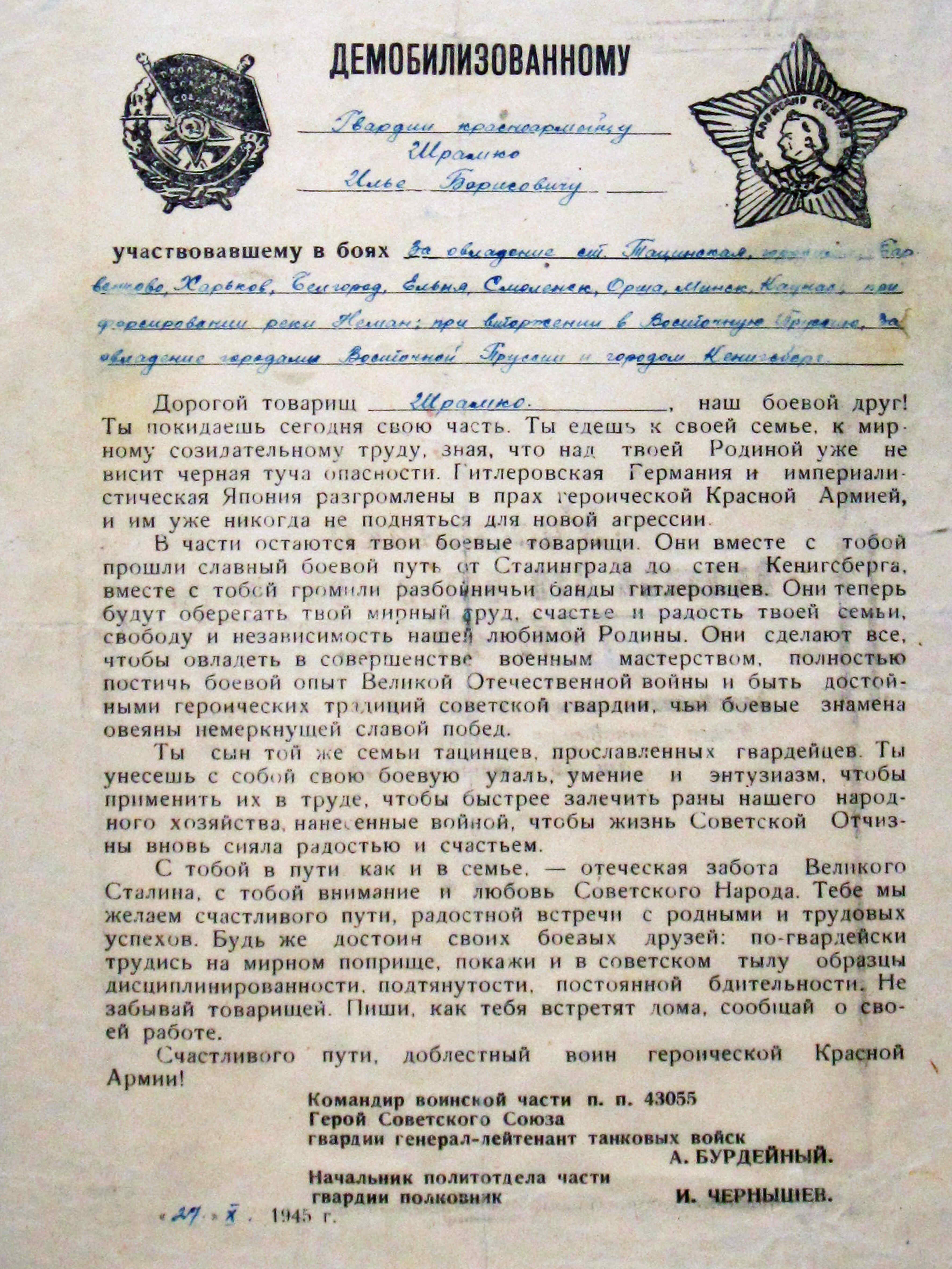 Мой отец, Шрамко Илья Борисович, родился 5 мая 1919 года в г. Беслан (железнодорожная станция Беслан) Северо-Осетинской АССР. Был призван в Красную Армию в октябре 1939 года. С июня 1941 года по май 1945 года участвовал в боевых действиях в составе 24-й мотострелковой бригады 24-го танкового корпуса, преобразованных 24.12.1942 г. в 4-ю гвардейскую мотострелковую Краснознаменную ордена Суворова бригаду 2-го гвардейского танкового корпуса в должности радиотелеграфиста - начальника радиостанции роты Управления в звании рядового - Гвардии рядового. Войну закончил в мае 1945 года в г. Кёнигсберг Восточная Пруссия. Имел тяжелое осколочное и пулевые ранения. Был участником Парада Победы на Красной площади в г. Москве 24 июня 1945 года. Демобилизован: 27 октября 1945 года. За участие в боевых операциях и проявленные при этом мужество и отвагу награжден Правительственными наградами: - Орденом «Красной Звезды»; - Медалью «За отвагу»; - Медалью «За боевые заслуги»; - Медалью «За оборону Сталинграда»; - Медалью «За взятие Кёнигсберга»; - Медалью «За победу над Германией в Великой Отечественной войне». В послевоенные годы награжден: - Орденом «Отечественной войны 1 степени»; - Памятными и Юбилейными медалями – неоднократно. Все годы, проведенные на войне, он считал самыми светлыми и незабываемыми, так как был причастен к Великой Победе в жесточайшей и кровопролитнейшей войне. Он всегда гордился своим участием в боевых операциях и был уверен, что это время, было самым счастливым в его жизни. Прадед с удовольствием делился своими воспоминаниями о войне в семье и с окружающими людьми. Оформил большой альбом фотографий о войне. Регулярно встречался с однополчанами и ветеранами. День Великой Победы был любимейшим его праздником. 9 февраля 1998 году погиб от руки бандита. Боевой путь В составе танкового корпуса бригада принимала участие в следующих войсковых операциях: 1. Старо-Оскольская операция (с 5 июня по 7 июля 1942). 2. Воронежско-Ворошиловградская стратегическая оборонительная операция (25.06.1942 - 24.07.1942). 3. Оборонительные бои на р. Дон, в районе Селявное (с 1 июля по 20 октября 1942): 4. Сталинградская стратегическая наступательная операция (19.11.1942 - 02.02.1943). - Среднедонская фронтовая наступательная операция (операция «Малый Сатурн»). 5. Операция «Сатурн». Тацинский танковый рейд. Корпус преодолев с боями за пять суток около 240 километров, разгромил в тылу противника базу снабжения, гарнизон и крупный аэродром, с которого обеспечивалось снабжение окружённой группировки немецко-фашистских войск под Сталинградом (84 немецких танка, 431 самолёт, 106 орудий при этом было уничтожено), перерезал железную дорогу на Сталинград и 24 декабря 1942 года овладел железнодорожной станцией и станицей Тацинская, Ростовская область. Противник, перебросив к Тацинской две танковые и две пехотные дивизии, пытался окружить и уничтожить корпус. После 4-х дневного боя корпус вышел из окружения. Кроме нанесения потерь немецко-фашистской группировке в Тацинской, танкисты уничтожали гарнизоны противника в окрестных хуторах и сёлах. (с 16 по 28 декабря 1942). 6. Миллерово-Ворошиловградская наступательная операция (операция «Скачок»). Ведет наступательные бои на Донбассе, действуя на ворошиловоградском направлении. Понеся большие потери, 18.2.1943 г. производит перегруппировку в районе Орехово с целью последующего наступлен