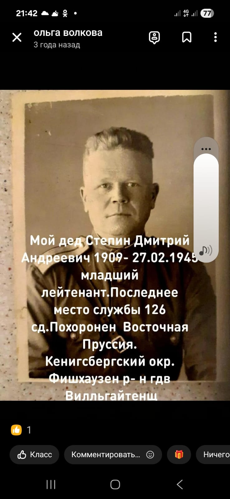 ПодробнееСтепин Дмитрий Андреевич , 1909 г.рождения воевал с фашистами , место службы 126, погиб и похоронен 27.02.1945 года в Восточной Пруссии,Кениксбергский округ. Фишхаузен р-н, ГДВ Валльгайтенш.