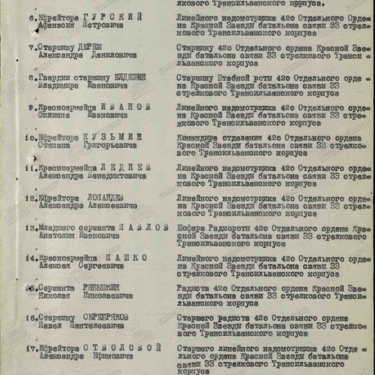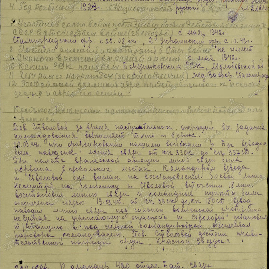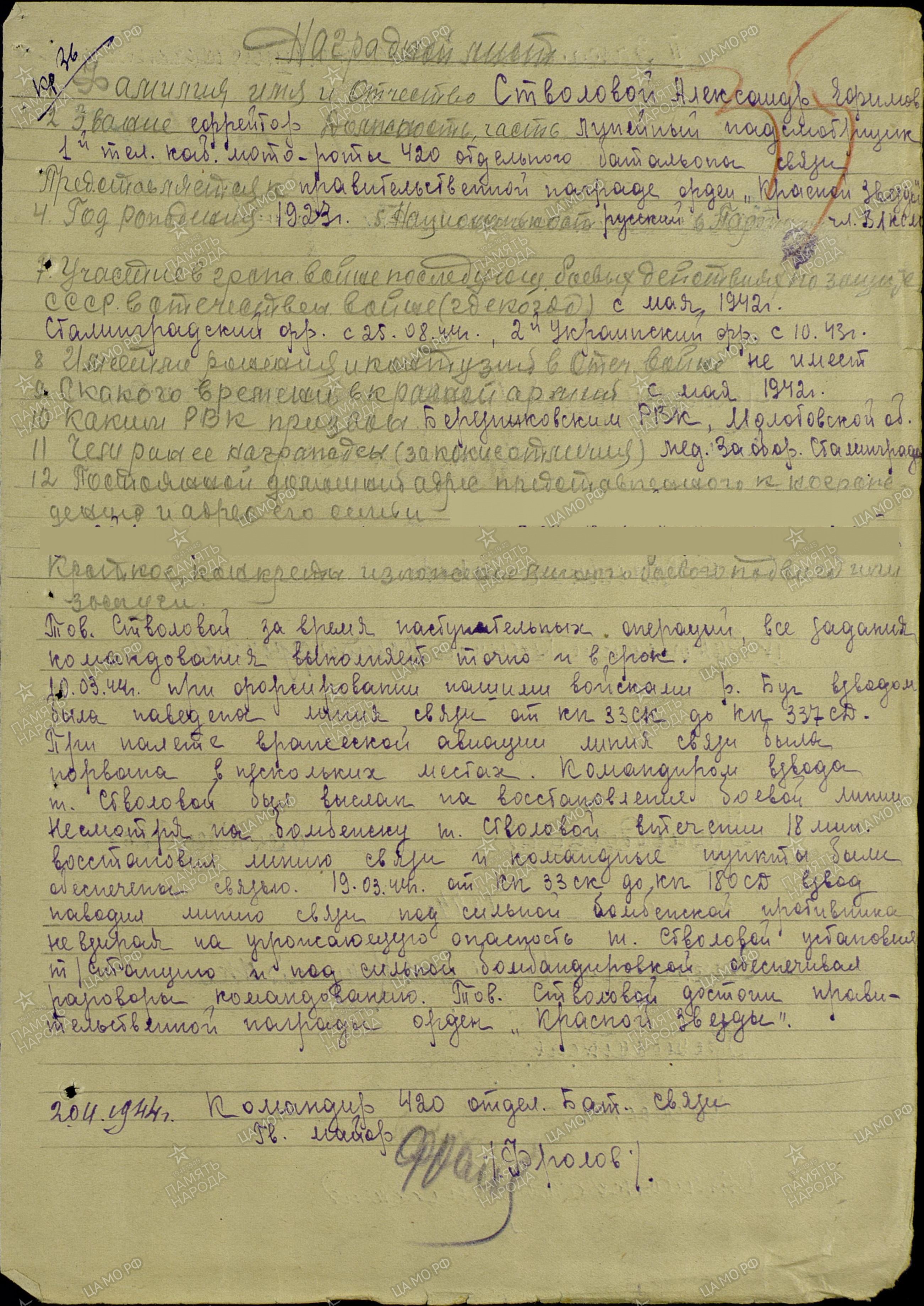 На фронте мой дедушка, Александр Ефимович, был Ефрейтором, затем Танкистом 420 отделения батальона связи 33 стрелкового Трансильвановского корпуса. Изначально полк стоял в Ростове, затем после подготовки был отправлен под Сталинград, где участвовал в его обороне. За оборону Сталинграда Александр Ефимович получил свою первую медаль. Вторая награда - медаль <За Отвагу> - была вручена за мужество и отвагу в боях с врагами Советского Союза. Орден <Красной Звезды> Александр Ефимович получил за подвиг, совершенный с 10.03.1944-19.12.1944гг. Долгих 4-е года находился в горячих точках нашей Родины. Участвовал в штурме Берлина, за что получил медаль <За Победу>. Домой он вернулся лишь в 1948году.