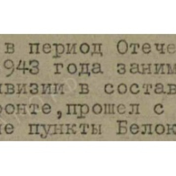 В ноябре 1941 г. был мобилизован на войну. Воевал на Калининском фронте. Был 3 раза ранен. Награжден медалью "За отвагу". До войны и после войны работал на почте.