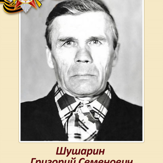 Мой дед, Шушарин Григорий Семенович, родился 28 февраля 1912г.р., в с. Нижние, Куртамышского района, Челябинской области. Был призван в ряды советской армии в 1941 года в звании красноармеец, а потом ефрейтор. За Боевые заслуги мой прадедушка был награжден Медалями: «За боевые заслуги» в 1943 году, «За отвагу» в 1944 году и Орденом Отечественной войны II степени в 1986 году. Он воевал в Витебской области в конной артиллерии. Послевоенное время он трудился на благо государства. Подтверждением заботы родного государства к рядовым труженикам села явилось награждение прадеда Орденом Трудового Красного Знамени. Мой прадед прожил 79 лет. Он умер 4 ноября 1991 года.