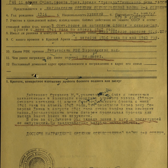 Боевой путь ветерана Это мой отец - Суховеев Михаил Иванович. Призывался 14.04.42 г. - Бузулукским РВК Воронежской области. Связист. После тяжёлого ранения он стал выступать на концертах для воинов - пел песни и был конферансье. Есть фото с прощальными гастролями в Польше 1945 г. Были ранения. При переправе через р. Одер получил медаль. Есть Орден Великой Отечественной Войны 2 степени. орден Красной Звезды, 2 медали За Отвагу. Ещё 2 медали за освобождение Варшавы и Берлина.