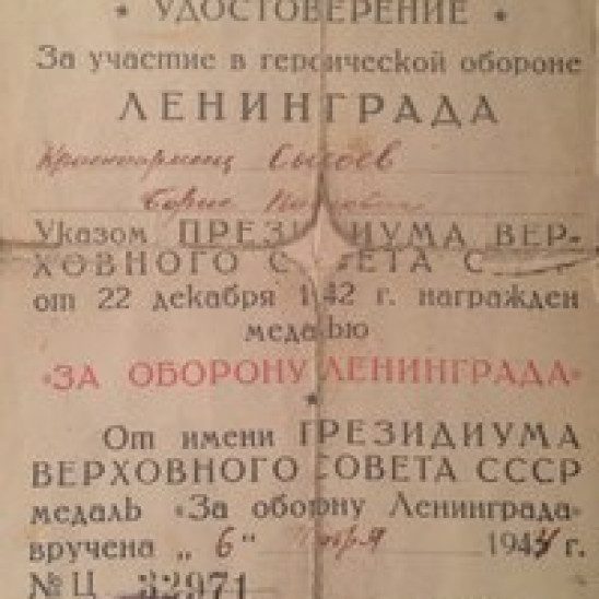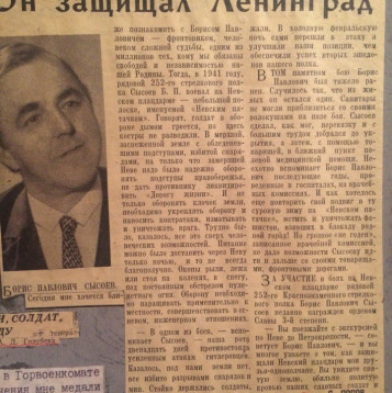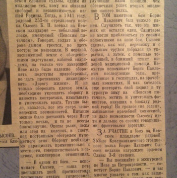 Сысоев Борис Павлович родился в Петербурге в 1911 году.Тогда, в 1941 году рядовой 252 - стрелкового полка Сысоев Б. П. воевал на Невском плацдарме - небольшой полоске именуемой" Невским пятачком" .На только что замерзшей Неве надо было надежно оборонять подступы правобережья,не дать противнику ликвидировать "Дорогу жизни". И не только оборонять клочок земли, необходимо укреплять оборону и наносить контратаки , изматывать и уничтожать врага.Трупы женщин и детей на улицах блокадного Ленинграда. Зенитные орудия ,отражающие воздушные налеты у Исаакиевского собора.Очередь за водою под артиллерийским обстрелом и бомбежкой.Сто двадцать пять граммов хлеба в сутки .Иссиня-прозрачные ручонки голодных детей и громадные на истощенных лицах глаза матерей -вот что видел и пережил отец моего мужа и дедушка моих детей и внуков. 22 декабря 1942 года Указом Президиума Верховного Совета СССР учреждена медаль "За Оборону Ленинграда" Сысоеву Борису Павловичу. За участие в боях на Невском плацдарме рядовой 252-го Краснознаменного стрелкового полка Сысоев Борис Павлович награжден Орденом Славы 3 -й степени. П гордимсяосле войны Борис Павлович Сысоев (тенор) артист Ленинградского ордена Ленина академического театра оперы и балета им. Кирова солист Ленинградского радиокомитета.Всю жизнь прожил в Ленинграде на улице Пушкинская дом 10, в Пушкинском сквере детство прошло-"Здесь я жил и трудился ,здесь родился и рос ,я с тобою сроднился,город,милый до слез!" Мы гордимся ,что у нас такой замечательный дедушка!Память о нем в наших сердцах! 9 мая держа в руках фотографию дедушки пойдем на парад Бессмертный полк!