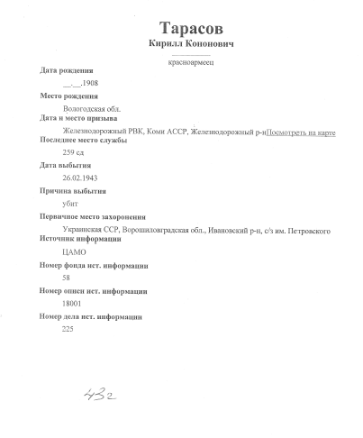 Первичное место захоронения: Украинская ССР, Ворошиловградская обл., Ивановский р-н, с/з им.Петровского.