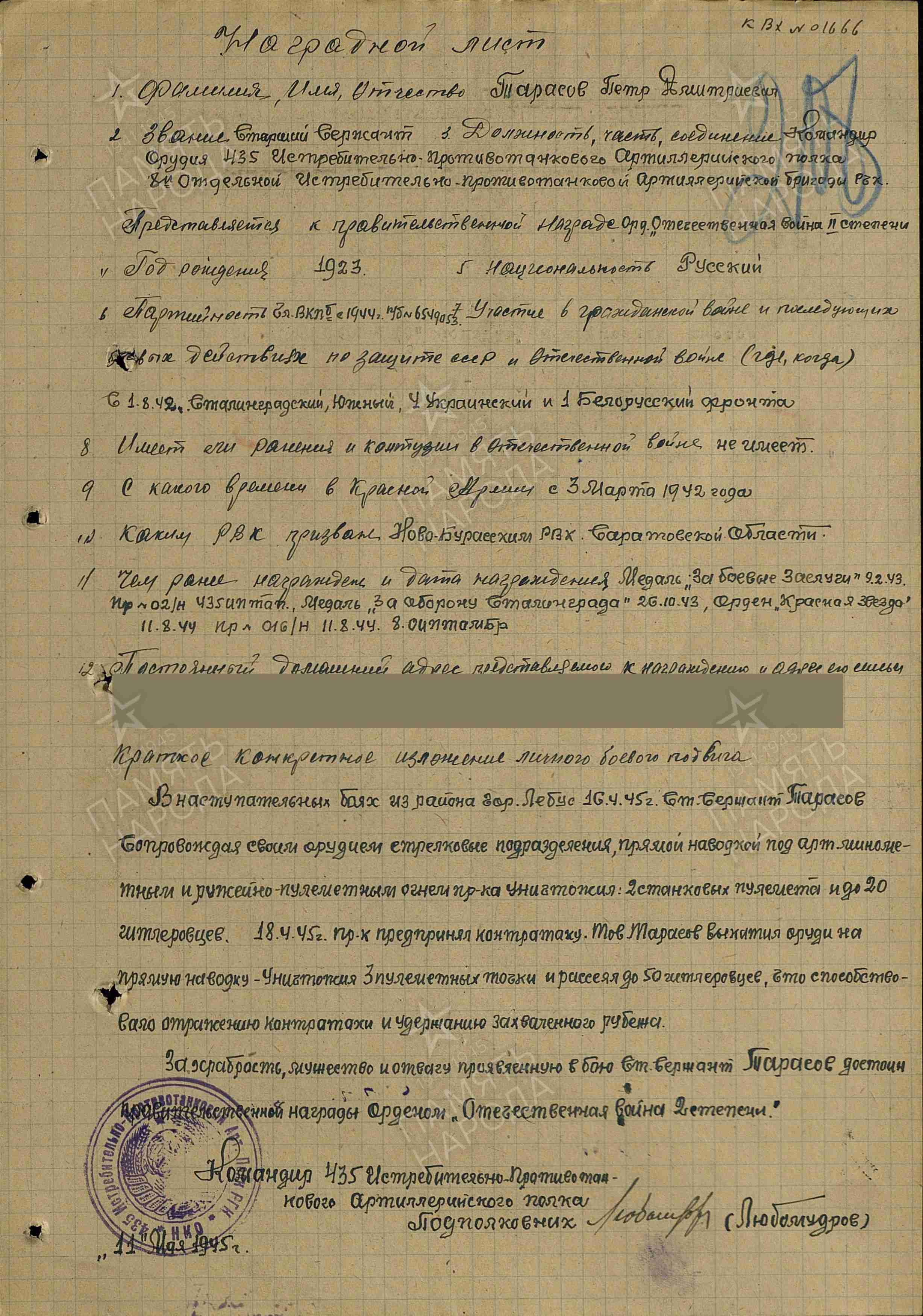 Был командиром орудия. Прошёл от Сталинграда до Берлина. Был дважды ранен. Награждён Орденом Красной звезды, Орденом Отечественной войны || степени, Медаль за взятие Берлина, Медаль За оборону Сталинграда, Медаль За боевые Заслуги, Медаль за победу над Германией в Великой Отечественной войне 1941-1945гг..