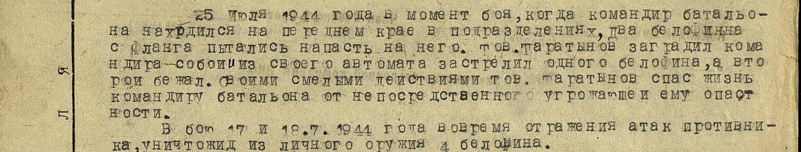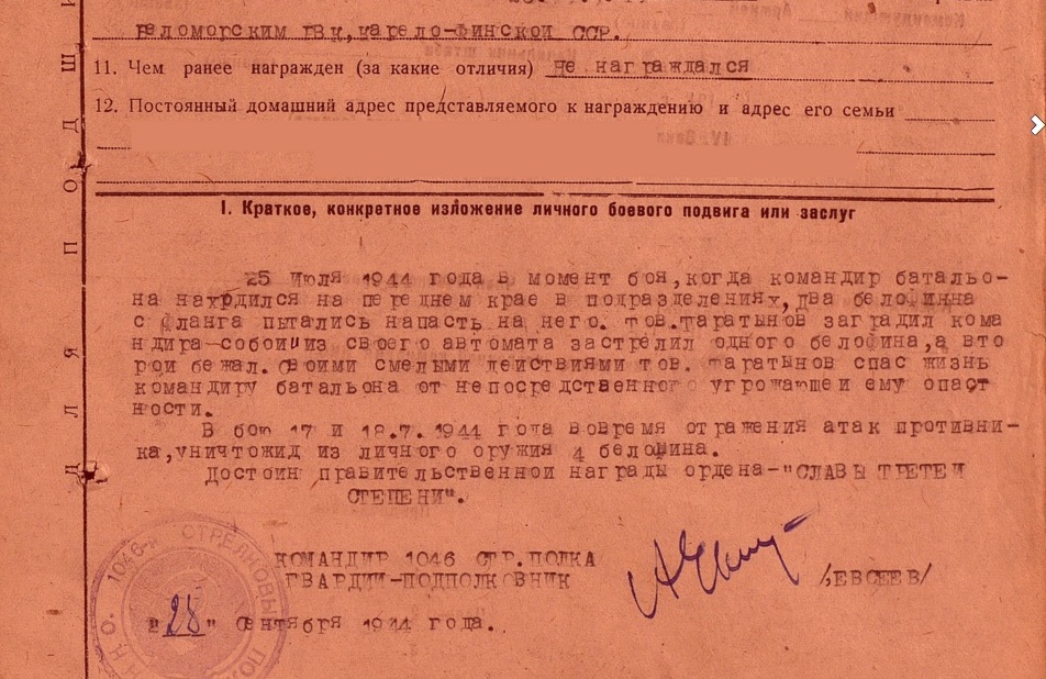 Сержант Таратынов И.А. был командиром отделения 5 Стрелковой роты 1046 Стрелкового полка. В РККА с 26.11.1941 года. Место призыва: Беломорский РВК, Карело-Финская ССР, Беломорский р-н. Совершил ряд подвигов за время военной службы, за что был награжден орденами.