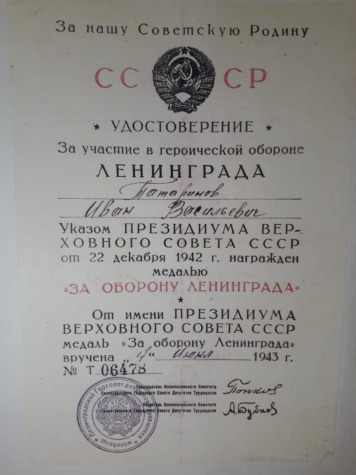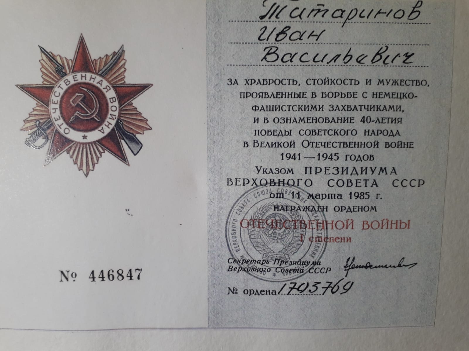 Национальность: русский Социальное положение: служащий Партийность: член ВКП(б) с 1927г. Гражданское образование: Рабфак в 1930 г. Политическое образование: 4-х месячные курсы пропагандистов в 1938 г. Военное образование: 6-месячные курсы политработников (г. Орджоникидзе) с 10. 1941 по 04.1942г. Сталинградское танковое училище с 05. 1942г. по 10. 1942 г. Резерв Политуправления Красной Армии (г. Горький) с 10. 1942г. по 01. 1943г. Комиссар роты по политчасти 1-ого Отдельного бронетанкового батальона Ленинградского фронта с 02.1943г. по 06. 1943г. Слушатель Танкового училища офицерского состава (г. Горький) с 07. 1943г. по 04. 1944г. Командир танковой роты "Т-34" 122 танковой бригады 3-го Прибалтийского фронта с 05. 1944 г. по 08. 1944 г. С 12.08.1944г. по 10. 1944г. - на излечении в военном госпитале № 2036 по случаю тяжелого боевого ранения в голову и правую руку. С 10. 1944г. по 02. 1945г. - в резерве Бронетанковых и механизированных войск Красной Армии. 2.02.1946г. уволен в запас в звании Старший лейтенант. В боях по освобождению Эстонской ССР по овладению Мосейной дорогой Полов-Рига в период с 10-11 го августа 1944 года Старший Лейтенант Татаринов И. В. проявил мужество и отвагу. Находясь в составе взвода разведки выдвинулся в район деревни Ледожи. Объехав деревню с правого фланга заметил в укрытии вражеский танк " ферденанд", который мешал продвижению наших танкам и пехоте. Товарищ Татаринов Иван Васильевич став в укрытие, прямой наводкой подбил его, в результате чего дал возможность продвигаться вперед нашей пехоте и танкам. Выйдя на шоссе, захватил исправный мотоцикл. За проявленное мужество и отвагу удостоен награждения Орденом "Красная Звезда" 12 августа 1944г. 1) Приказ 122 Танковой Краснознаменной бригады №043-и 16 авг. 1944г. От имени Президиума Верховного Совета Союза ССР за образцовое выполнение боевых заданий Командования на фронте борьбы с немецкими захватчиками и проявленные при этом доблесть и мужество, наградить Орденом "Красная Звезда" Старшего Лейтенанта Татаринова Ивана Васильевича. 2) Указом Президиума Верховного Совета СССР медаль "За оборону Ленинграда" вручена 17 июня 1943г. 3) Указом Президиума Верховного Совета СССР от 9 мая 1945года награжден медалью "За Победу Над Германией в Великой Отечественной Войне 1941-1945гг. " 2 февраля 1946г. 4) Указом Президиума Верховного Совета СССР от 11 марта 1985г. награжден Орденом " Отечественной Войны 1 степени" за храбрость, стойкость и мужество, проявленные в борьбе с немецко-фашисткими захватчиками, и в ознаменование 40-летия победы советского народа в Великой Отечественной войне 1941-1945гг.