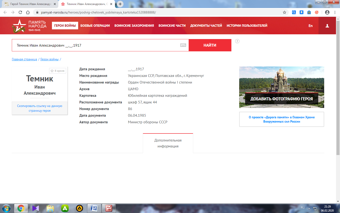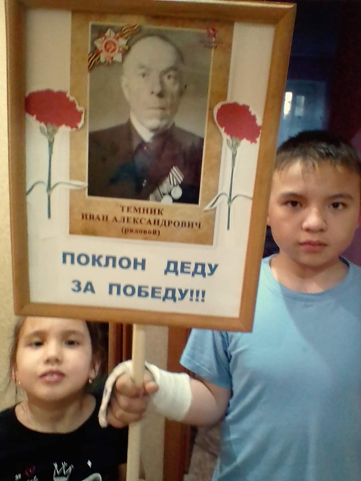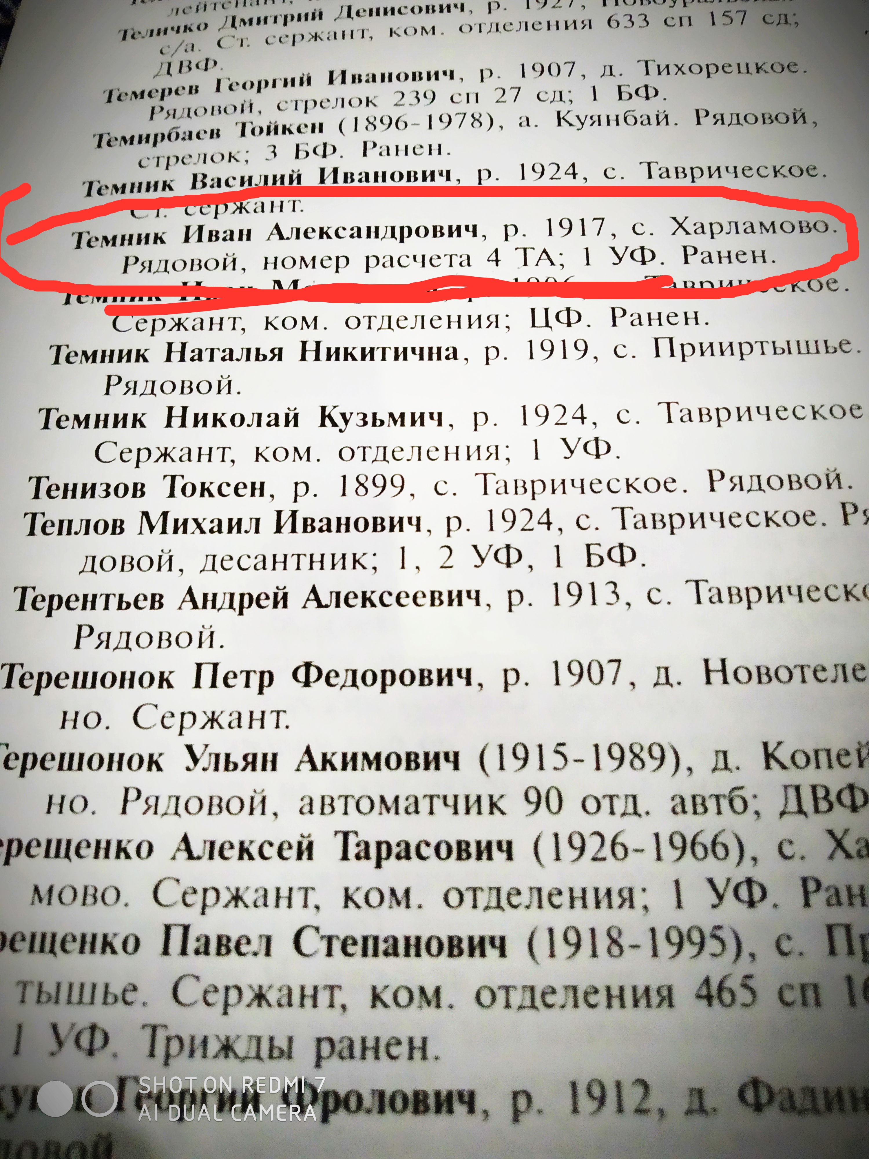 Омское региональное отделение Общероссийского общественного гражданско-патриотического движения «Бессмертный полк России» Омское региональное отделение « Российское военно-историческое общество» Исследовательская работа Мой прадед - мой герой Великой Отечественной войны Выполнила: ученица 7 "А" класса МБОУ ДО «Центр детского творчества» Саргатского МР Тайгамбаева Александра Серикбаевна Руководитель: Тайгамбаева Т.В. рп Саргатское - 2023 Содержание работы Введение 3 Глава 1.Великая Отечественная война и мой прадедушка 1.1 Кто он? Мой прадед? 5 1.2 Битва за Москву 6 1.3 Освобождение других городов и бои за Белоруссию 8 1.4 Послевоенные годы и мирная жизнь прадеда 11 Глава 2. Память жива. 2.1.Анализ исторических документов 13 2.2. Участие во Всероссийской акции « Бессмертный полк» 17 2.3 Участие в проекте «Дорога Памяти» и «Правнуки Победителей» 21 Заключение 24 Список литературы 25 Введение «В Сибири не было войны, но до сих пор на сердце раны. В Сибири не было войны, но в каждом доме ветераны. В Сибири не было войны, но, пояс затянув потуже, Сибирь работала на фронт, назло врагам и лютой стуже. В Сибири не было войны, но все кто мог "ковал" победу И шли Сибирские полки, в них наши прадеды и деды...» И.Захарова. Прошло уже 78 лет, как закончилась Великая Отечественная война, а эхо её до сих пор не затихает в людских сердцах. Да, мы не имеем права забыть ужасы этой войны. Мы не имеем права забыть тех солдат, которые погибли ради того, чтобы мы сейчас жили. В боях Великой Отечественной войны особое место занимают сибиряки. Сибирские дивизии и полки сражались на всех участках громадного советско-германского фронта. В городе Омске и области было сформировано 20 воинских подразделений, среди них 282, 264, 308 стрелковые дивизии, 70 батальон морской пехоты, батальоны связи и батальоны санитарного обеспечения [2] В первые дни войны сибиряки вместе с другими воинами Красной Армии приняли на себя удар врага и насмерть стояли на рубежах родной страны. Участником тех великих исторических событий был мой прадедушка Темник Иван Александрович. Он защищал Родину, семью ради будущего и ради меня тоже. И мне хочется рассказать о нем, отдавая тем самым ему долг памяти, уважения и преклонения его героизму. Его сейчас уже нет с нами, но он продолжает жить в воспоминаниях нашей семьи. Исходя из вышесказанного, нами были выдвинуты: Объект исследования – Великая Отечественная война 1941-1945 годов; Предмет исследования – участие прадеда в военных операциях, его вклад в Великую Победу Цель работы: изучить с помощью исторических источников, воспоминаний родственников героический путь прадеда в ходе ВОВ, увековечить его память Задачи: 1) изучить исторические документы по данной теме; 2) проанализировать, с помощью бесед осведомленность родственников о прадедушке; 3)представить и загрузить материалы о прадедушке на сайт «Правнуки Победителей» Практическая значимость данной работы состоит в том, что она послужит не только нашей семье, но также поможет другим ребятам, которые смогут провести аналогичную работу и восстановить данные о своих героях, участниках ВОВ. Собранные материалы научат видеть и восхищаться исторической памятью предков. Надеемся, что найдется немало ребят, которых наша работа позовет в дорогу - к новым открытиям. Глава 1.Великая Отечественная война и мой прадедушка 1.1 Кто о