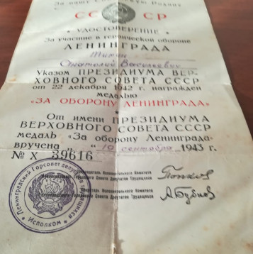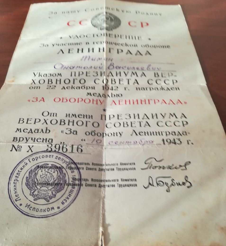 Боевой путь ветерана Место призыва: Лежневский РВК, Ивановская обл., Лежневский р-н Место службы: 152 Армейского Запасного Стрелкового полка По защите СССР : Отечественная война с 29.08.41г «Центральный и Ленинградский фронт» «Будучи шофёром 154 отд. Арт. Гауб. полка, 24 октября 1941, в р-не Бородино (под Москвой) во время боя, при форсировании речки под огнём противника, заменив убитого шофёра, вывел с переправы горящую автоцистерну, чем предотвратил пожар и разрушение переправы и обеспечил продвижение боевой техники своей части. При взрыве цистерны и бензобака тяжело ранен и контужен, после чего потерял способность к физическому труду. На фронт прибыл вновь добровольно 8.02.1943г., с ротой ПГО как нестроевой. За время работы в полку проявил себя дисциплинированным работником штаба.»