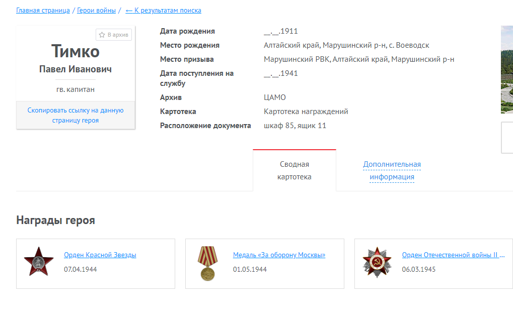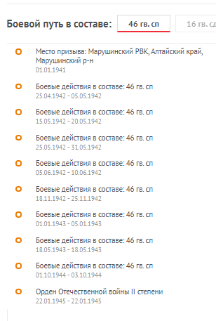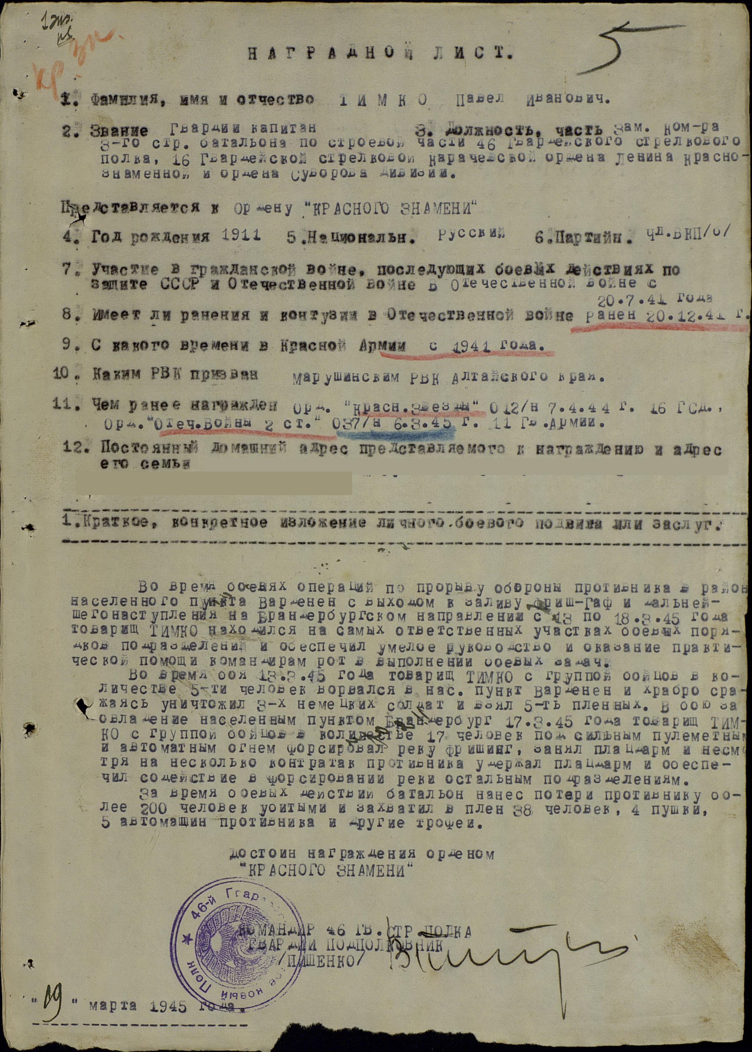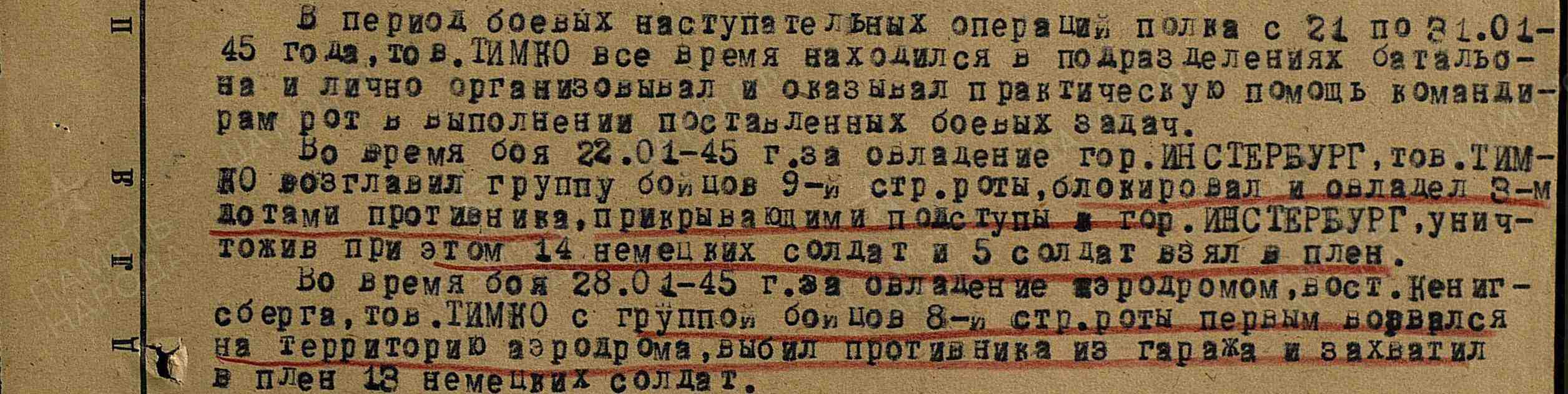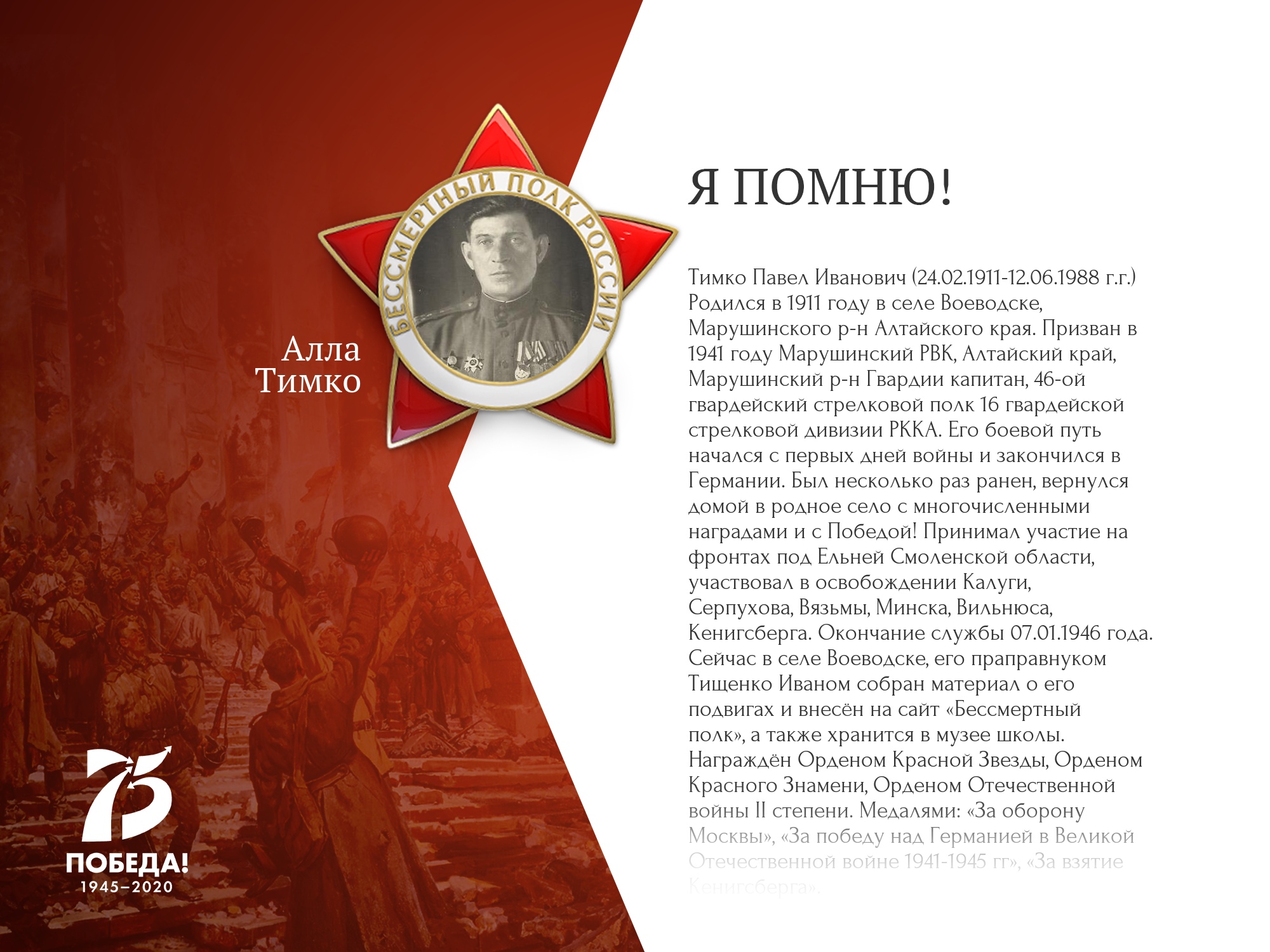 Очерк Этот очерк я посвящаю своим внукам, поколению, которое не знает, что такое ВОЙНА… Приходит время, когда каждый из нас хочет узнать историю своей семьи. Её корни, родственные связи, о тех, кто рядом, с кем соединила нас жизнь. Листая страницы родословной, можно удивляться, восхищаться, преклонятся, но самое главное надо помнить, тех кого уже нет и стараться всё это сохранить и передать своим потомкам. Поколение военных лет - это мои прародители и родители. Война ворвалась в каждую семью и оставила там свой страшный след. Когда в жизнь мирного населения врывается война, она всегда приносит горе и несчастье, нарушает привычный уклад жизни. Мои родители - это дети войны. Они знали, что такое холод, голод и разруха. В моей памяти навсегда останется момент, когда мама ела хлеб… Она относилась к нему как к лакомству, очень бережно, всегда собирала все крошки и никогда не выкидывала. Оставшие кусочки и вчерашний хлеб сушила и съедала без остатка. К сожалению, в нашей семье не осталось в живых, кто был участником или свидетелем этих страшных событий. Но в моей жизни был человек, который прошел все тяготы и лишения Великой Отечественной войны. Мой дед - Тимко Павел Иванович, гвардии капитан, 46 гвардейского стрелкового полка 16 гвардейской стрелковой дивизии РККА, прошёл её от начала и до Великой Победы. Родился Павел Иванович в 1911 году в селе Воеводске, Марушинского района, Алтайского края. Когда началась Великая Отечественная война ему уже было 30 лет. За его плечами осталась гражданская война, поэтому, когда началась война он в первых рядах ушёл на фронт. Боевой путь деда, Тимко Павла Ивановича, подробно изучила по материалам наградных документов. Читая скупые факты о боевых подвигах деда, вижу бесстрашного, смелого и волевого человека, который идёт в первых рядах. Долгим и трудным был его ратный путь. Всю войну он прошел на передовой, познав все трудности военных будней. Павел Иванович принимал участие на фронтах под Ельней Смоленской области, участвовал в освобождении Калуги, Серпухова, Вязьмы, Минска, Вильнюса, Кенигсберга. До 1944 года был дважды ранен и свою первую награду он получил за бои под городом Ельня. Как много это короткое слово говорит сердцу каждого русского солдата, который прошёл этот путь! Имя маленького смоленского городка стало символом наступления. Завоевание Ельнинского плацдарма в 1941 году было одной из первых побед советского оружия в Отечественной войне. В этих боях участвовал и мой дед, где, проявив свои боевые качества из рядовых вырос до старшего лейтенанта-помощника пулемётной роты, за мужество и героизм получил Орден Красной Звезды. А потом битва под Москвой. Битва под Москвой - самая масштабная во второй мировой войне. Именно здесь, недалеко от столицы, крупнейшего в мире государства, хваленая гитлеровская армия, впервые потерпела серьезное поражение. Разгром фашистских войск под Москвой явился началом значительного поворота в ходе войны и истории. Окончательно был провален гитлеровский план «быстрой войны»; впервые был развеян миф о «непобедимости» гитлеровской армии. И долгий путь домой… В 1945 году во время боевых операций по прорыву обороны противника в районе населённых пунктов Варденен и Брандербург, выходом к заливу Фриш Гаф и дальнейшего наступления, находился на самых ответственных участках боевых 