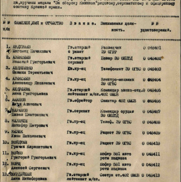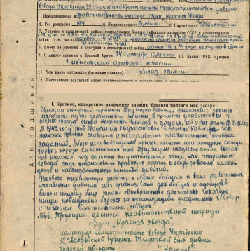Призван в Красную Армию в 1939 г. Ветеран и участник ВОВ Старшина комендантского взвода Управления 32 гвардейской стрелковой Таманской Краснознаменной дивизии. Писарь. Награжден Орденом Красной Звезды дважды , Орденом Отечественной войны II степени, Медаль за отвагу, Медаль за боевые заслуги, Медаль за взятие Кенинсберга, Медаль за оборону Кавказа, Медаль за оборону Севастополя. Участвовал в Северо-Кавказском Фронте (август 1942-октябрь 1943),Отдельной Приморской армии (ОПАРМ) (октябрь 1943-май 1944), Прибалтийском фронте (май 1944-июль 1944), Белорусском фронте (июль 1944-1945). В августе 1941 был ранен. Окончание войны встретил в Прибалтике.