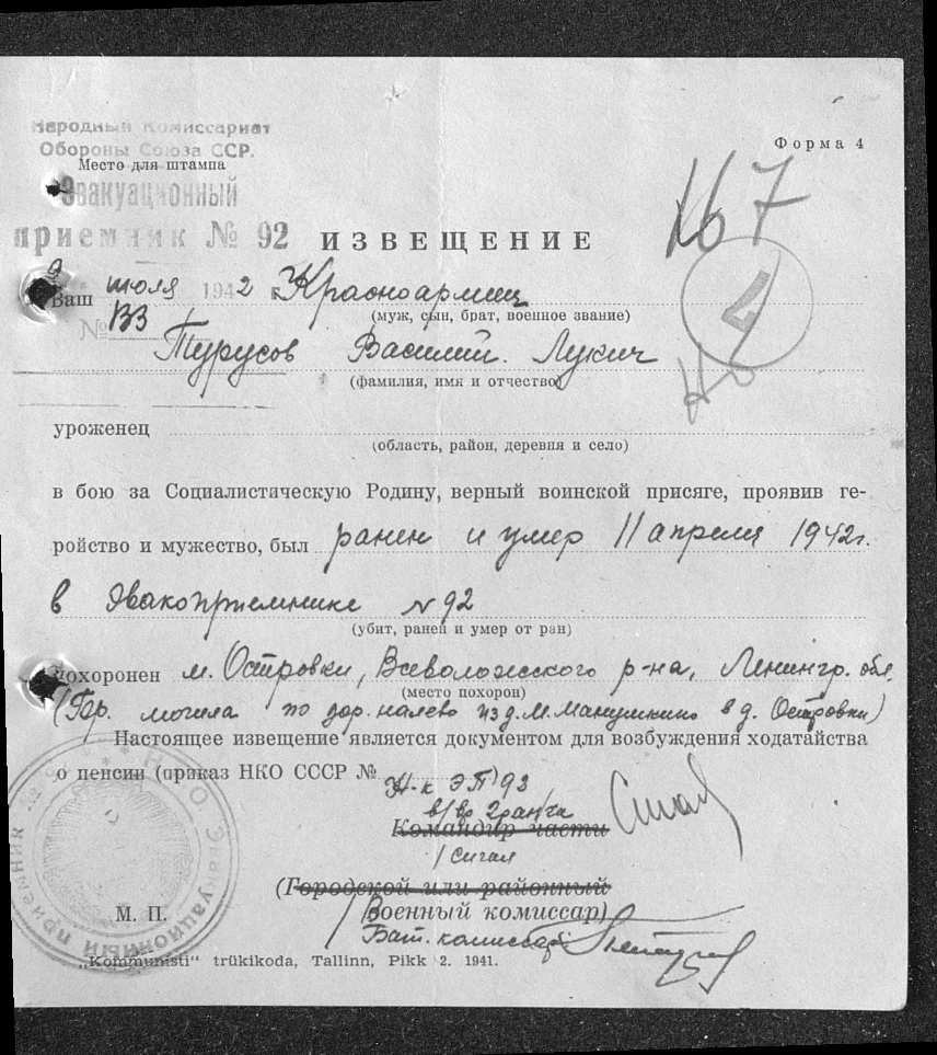 Турусов Василий Лукич родился 14 января 1894 года в селе Частоостровское Емельяновского района Красноярского края. Колхозник. Призван в Советскую Армию зимой 1941 года. Рядовой, пехотинец. Под г. Ленинградом был тяжело ранен и умер от ран в эвакоприемнике №92 11 апреля 1942 года. Захоронен в Братской могиле в деревне Озерки Разметелевского сельского поселения Всеволожского района Ленинградской области. Дома оставались жена, дочь и два сына.