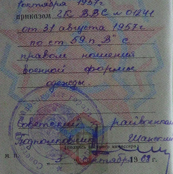 от 31 августа 1957 года был уволен в запас с правом ношения военной формы. После увольнения в запас, мы всей семьей