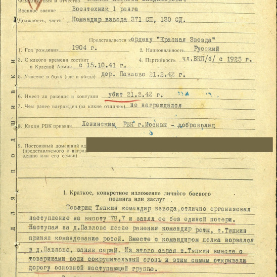Тяпкин Алексей Владимирович, служил начальником пожарной части на Пречистенке до 1937 года. В 1937 году по доносу был арестован, отсидел один год на Лубянке, но отказался подписываться под предъявленными обвинениями и был освобожден - далее работал пожарным инспектором. 15 октября 1941 года вступил в ополчение, в 1-ый полк 3-ей Московской Коммунистической стрелковой дивизии. Участвовал