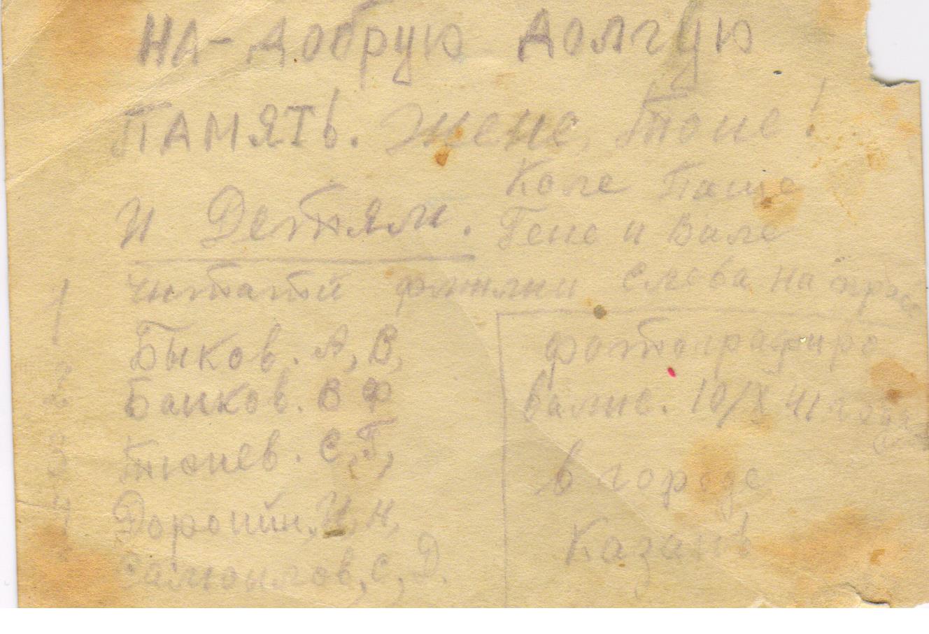 Разведчик 449 гаубичного полка 112 стрелковой дивизии Западного фронта был тяжело ранен 18.07.1941 осколком от мины. Фотокарточка была сделана в Казани (Эвакогоспиталь №1673). В армии по 08.11.41.