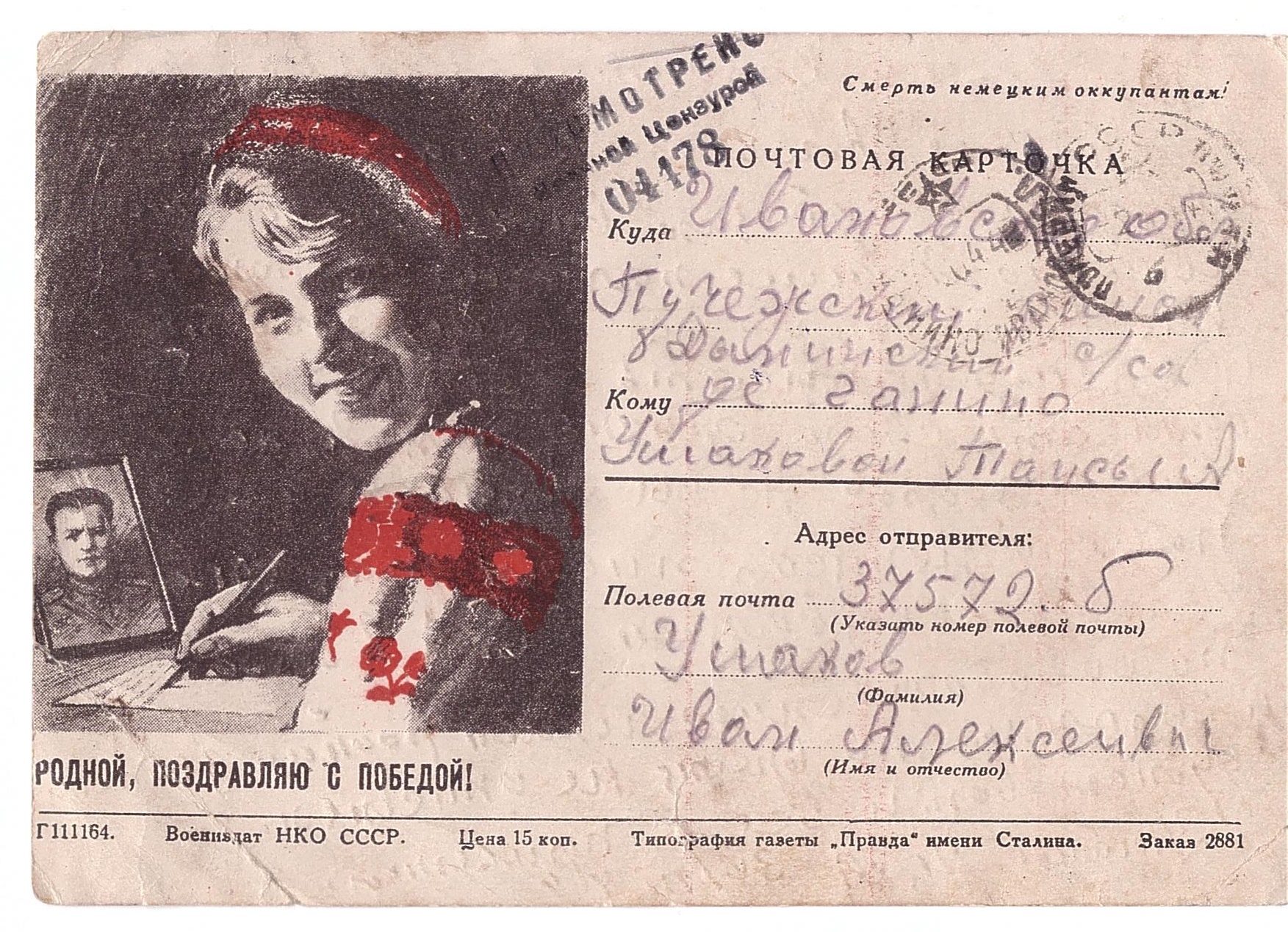 Пропал без вести в 1944 году, последнее письмо датировано 30.03.1944 годом, полевая почта 37572.б