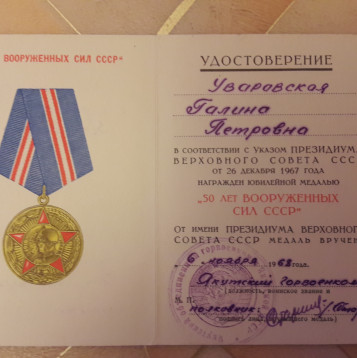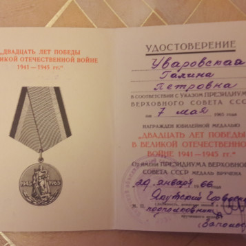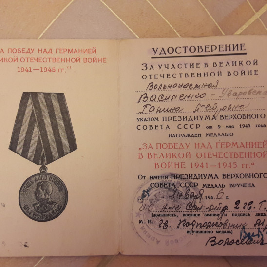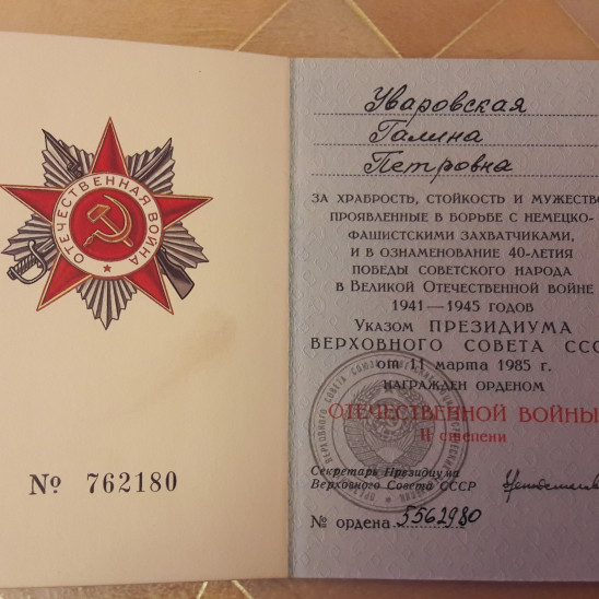 В 1937 году ее отца расстреляли как «врага народа»В 1938 году ее маму расстреляли тоже как «жену врага народа»В то время ей было 11 лет, а сестре Ольге 16 лет. Они жили в большом доме где было много книг, звучала музыка, читали стихи, пели песни и двух девочек выселили из дома в маленькую комнатку, где они жили до войны.В 1941 году началась война, город Горловка, Украинская ССР был оккупирован немецко-фашистскими войсками 2 ноября 1941 года, детей и женщин угоняли в Германию.Ночью детей и женщин закрыли в сарае, а утром их должны были погрузить в поезд и увезти в Германию. Ночью женщины сделали подкоп и вместе с детьми бежали в рассыпную в лес. Немцы стреляли по бегущим детям и женщинам, больше она свою сестру так и не нашла, возможно ее убили.Потом она пряталась в лесу и однажды вышла на станцию и в ящике из под угля спряталась. Эшелон с немецкими солдатами и орудием шел воевать в глубь на территорию нашей родины. Было очень страшно, она никогда не рассказывала подробности, а всегда только говорила было очень страшно.(Ей тогда было 13 лет)Она добралась до Палаточного госпиталя который сразу шел за нашим войсками и так она дошла до Германии. В госпитале недалеко от Берлина в военном городе Лихин встретила будущего мужа. Это был 1944 год. Октябрин Евдокимович после отравления лежал в госпитале (ему было 20 лет, а ей 16) через год они поженились. Октябрин был оставлен на военную службу в Германии еще на 5 лет.В 1948 году в Германии родилась моя мама- Уваровская (Дикарева) Людмила Октябриновна.