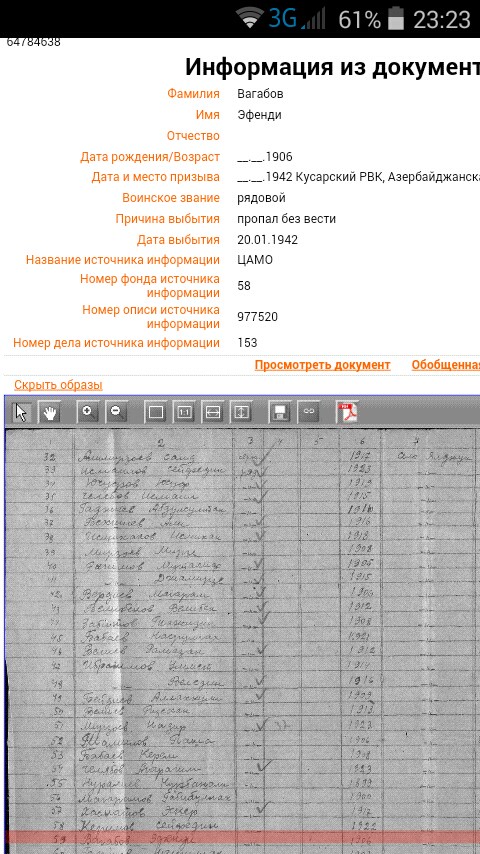 Наш дедушка ушёл на войну в январе 1942 года. Из Азербайджанской ССР. г. Кусары. После было два письма из Крыма, Севастополя. Письма до нас не дошли. Бабушка, во время переезда из Азербайджана в Дагестан потеряла их. С её только слов мы знаем, что он защищал Севастополь. Он считается без вести пропавшим.